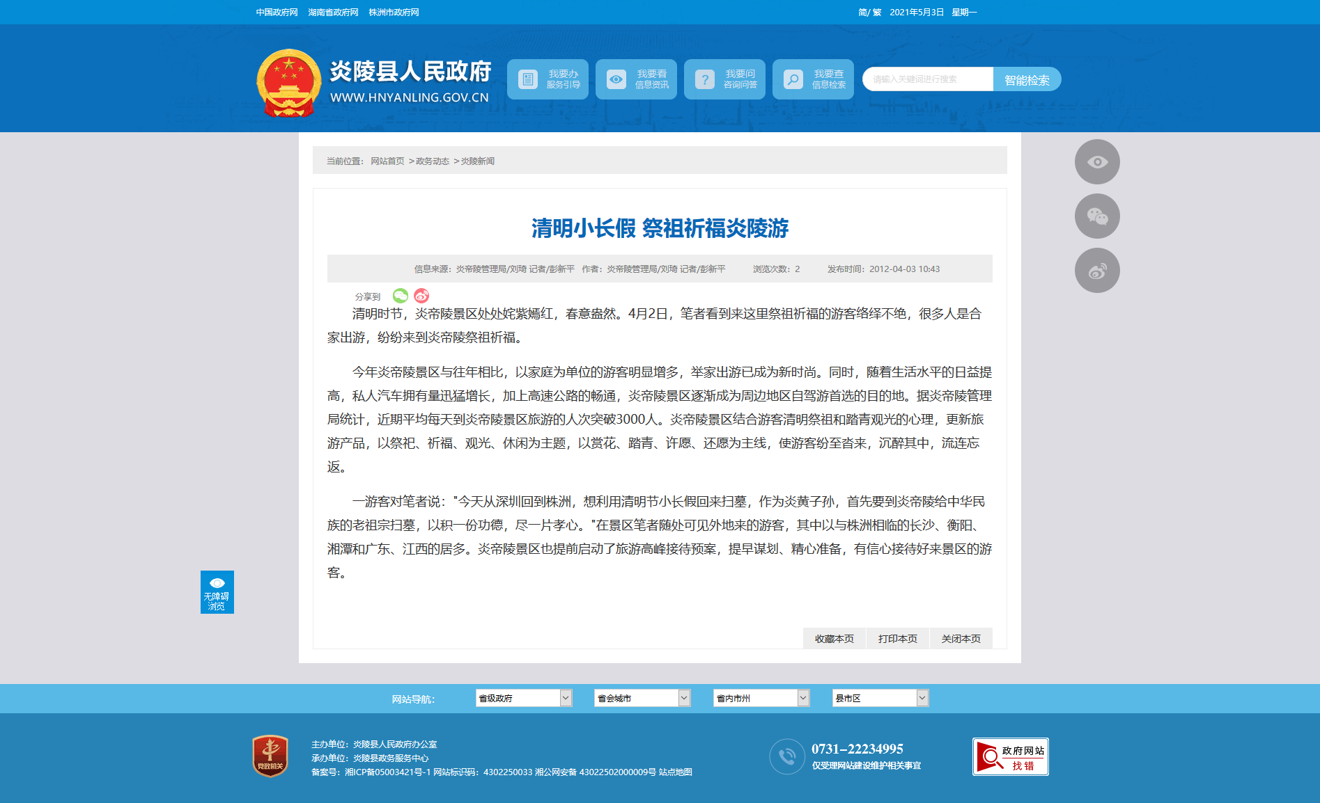 一游客对笔者说:"今天从深圳回到株洲,想利用清明节小长假回来扫墓,作为炎黄子孙,首先要到炎帝陵给中华民族的老祖宗扫墓,以积一份功德,尽一片孝心。"在景区笔者随处可见外地来的游客,其中以与株洲相临的长沙、衡阳、湘潭和广东、江西的居多。炎帝陵景区也提前启动了旅游高峰接待预案,提早谋划、精心准备,有信心接待好来景区的游客。