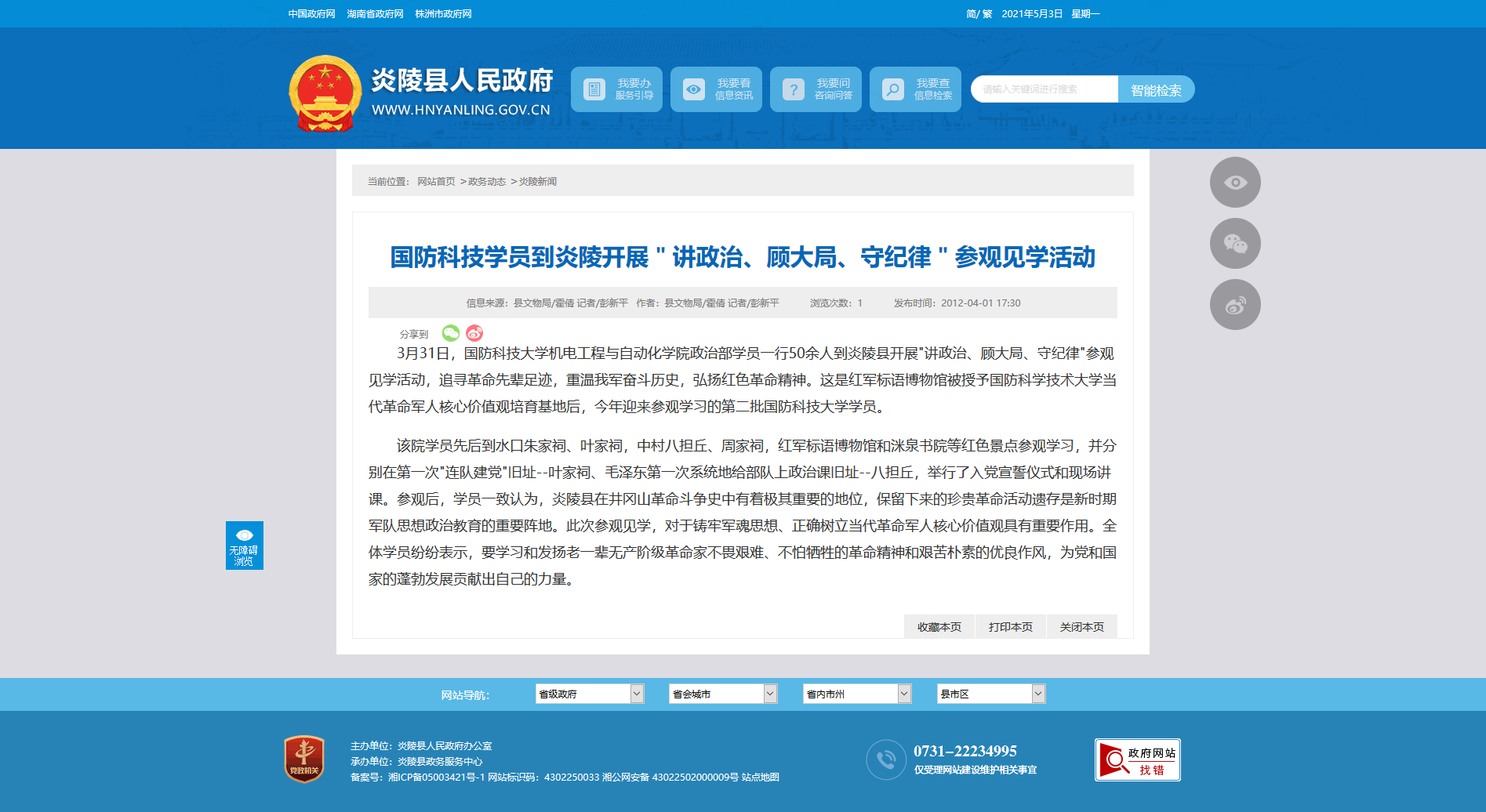 3月31日,国防科技大学机电工程与自动化学院政治部学员一行50余人到炎陵县开展"讲政治、顾大局、守纪律"参观见学活动,追寻革命先辈足迹,重温我军奋斗历史,弘扬红色革命精神。这是红军标语博物馆被授予国防科学技术大学当代革命军人核心价值观培育基地后,今年迎来参观学习的第二批国防科技大学学员。