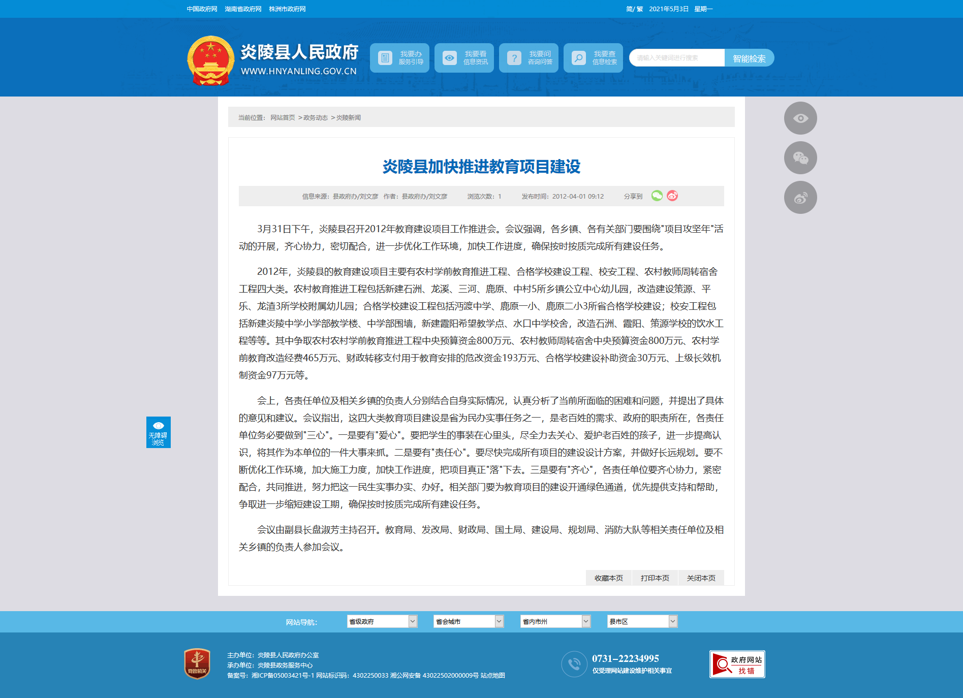 3月31日下午,炎陵县召开2012年教育建设项目工作推进会。会议强调,各乡镇、各有关部门要围绕"项目攻坚年"活动的开展,齐心协力,密切配合,进一步优化工作环境,加快工作进度,确保按时按质完成所有建设任务。