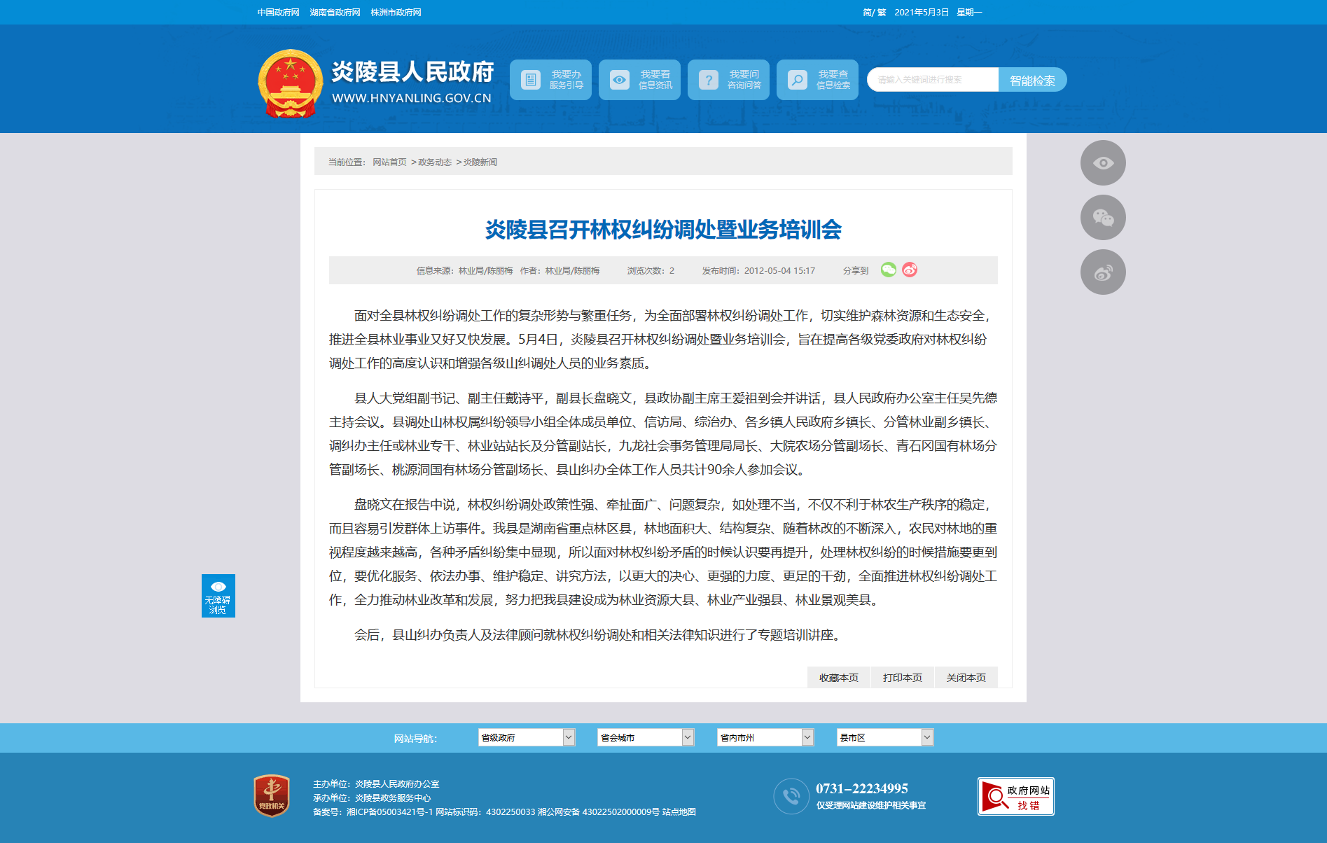 面对全县林权纠纷调处工作的复杂形势与繁重任务,为全面部署林权纠纷调处工作,切实维护森林资源和生态安全,推进全县林业事业又好又快发展。5月4日,炎陵县召开林权纠纷调处暨业务培训会,旨在提高各级党委政府对林权纠纷调处工作的高度认识和增强各级山纠调处人员的业务素质。
