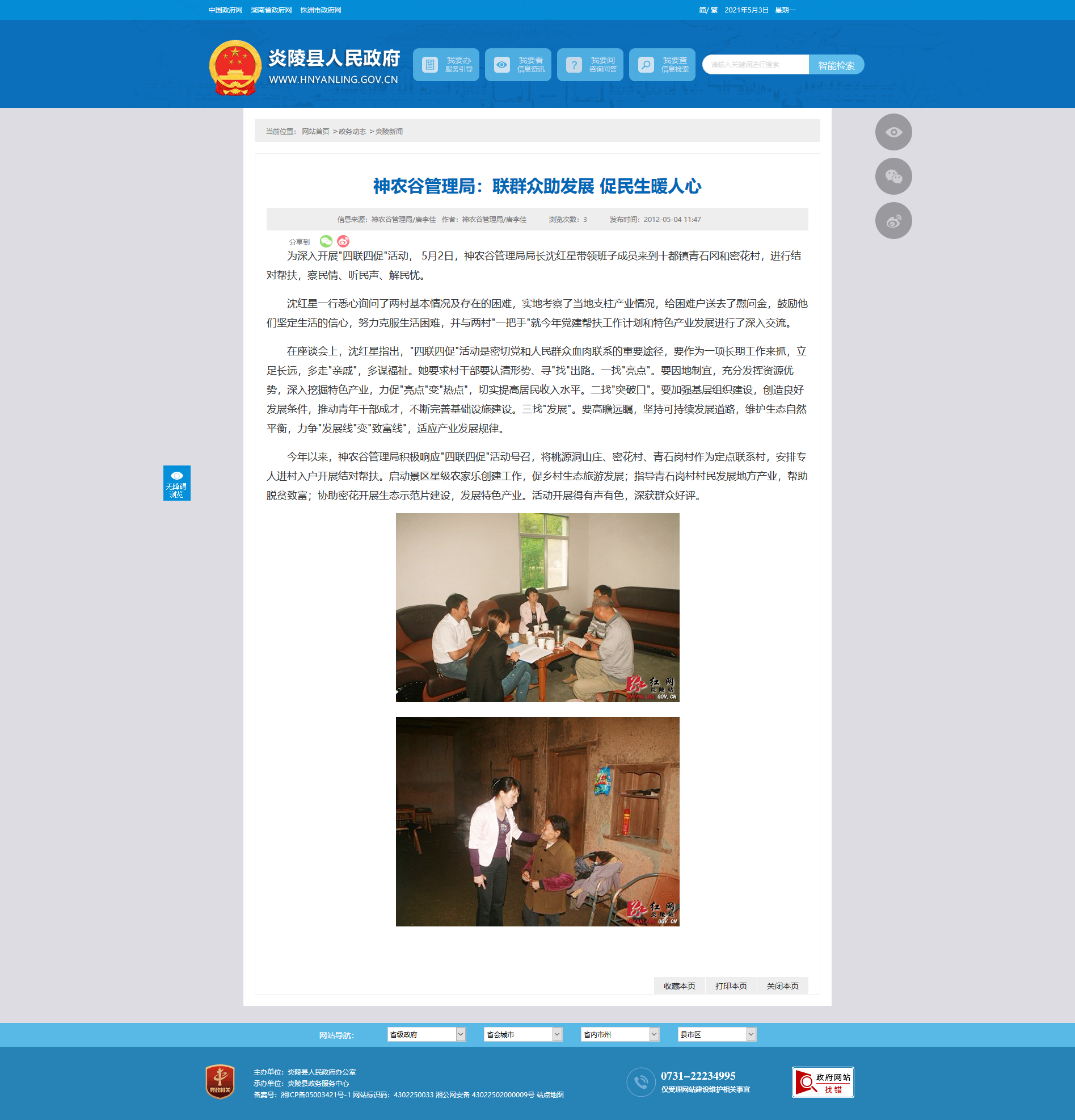 今年以来,神农谷管理局积极响应"四联四促"活动号召,将桃源洞山庄、密花村、青石岗村作为定点联系村,安排专人进村入户开展结对帮扶。启动景区星级农家乐创建工作,促乡村生态旅游发展;指导青石岗村村民发展地方产业,帮助脱贫致富;协助密花开展生态示范片建设,发展特色产业。活动开展得有声有色,深获群众好评。
