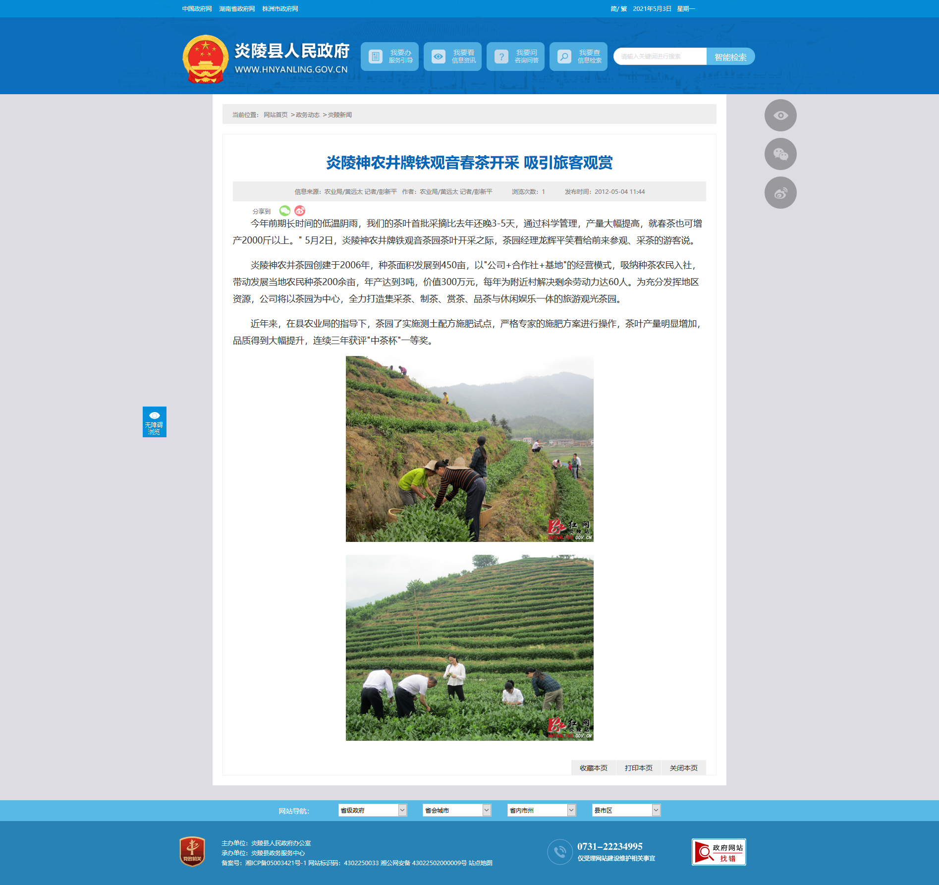 今年前期长时间的低温阴雨,我们的茶叶首批采摘比去年还晚3-5天,通过科学管理,产量大幅提高,就春茶也可增产2000斤以上。" 5月2日,炎陵神农井牌铁观音茶园茶叶开采之际,茶园经理龙辉平笑着给前来参观、采茶的游客说。