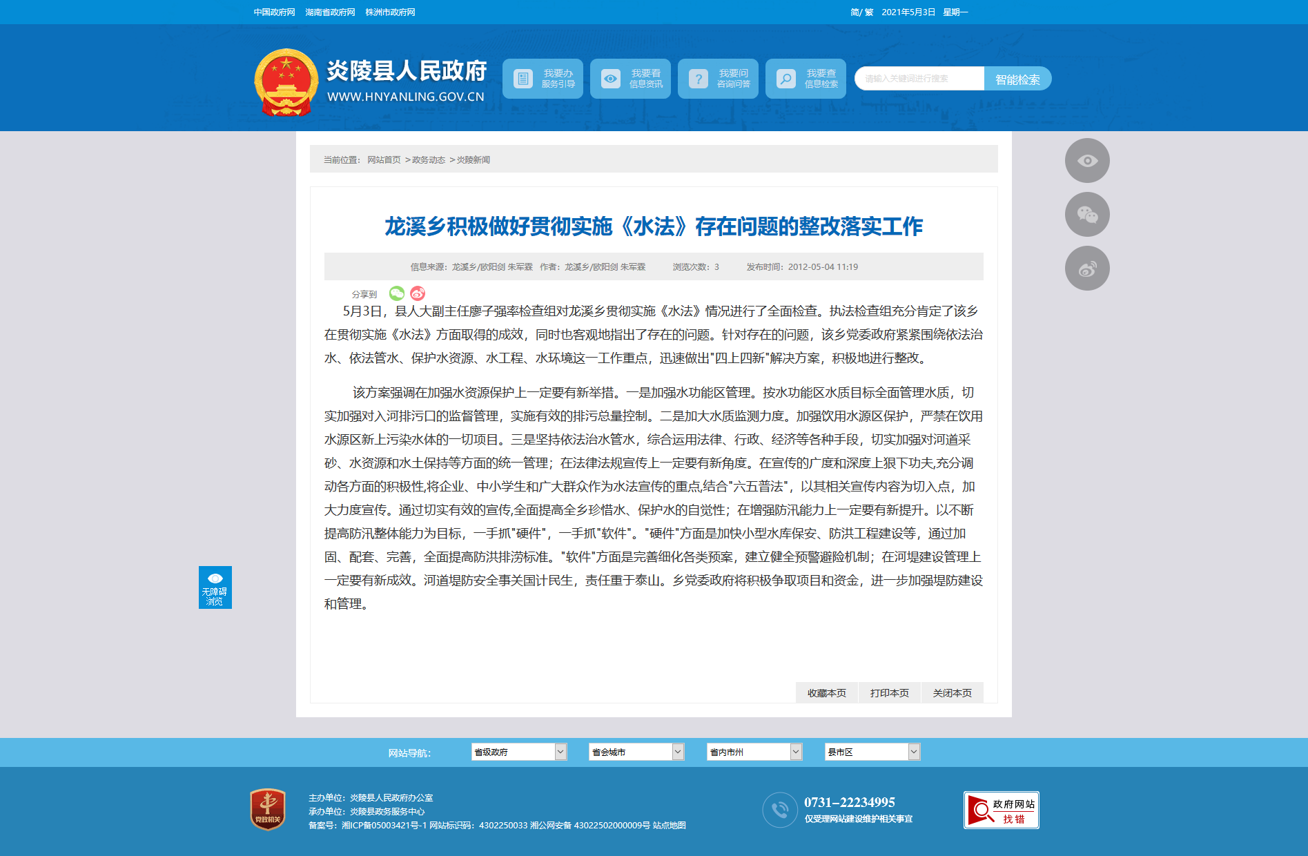 5月3日,县人大副主任廖子强率检查组对龙溪乡贯彻实施《水法》情况进行了全面检查。执法检查组充分肯定了该乡在贯彻实施《水法》方面取得的成效,同时也客观地指出了存在的问题。针对存在的问题,该乡党委政府紧紧围绕依法治水、依法管水、保护水资源、水工程、水环境这一工作重点,迅速做出"四上四新"解决方案,积极地进行整改。