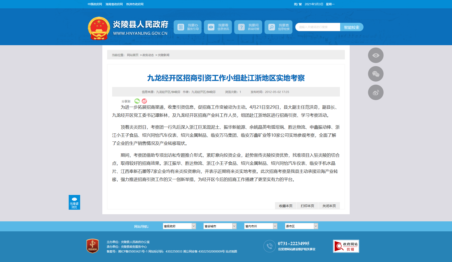 为进一步拓展招商渠道,收集引资信息,促招商工作变被动为主动。4月21日至29日,县大副主任范洪奇,副县长、九龙经开区党工委书记谭新林,及九龙经开区招商产业科工作人员,组团赴江浙地区进行招商引资、学习考察活动。