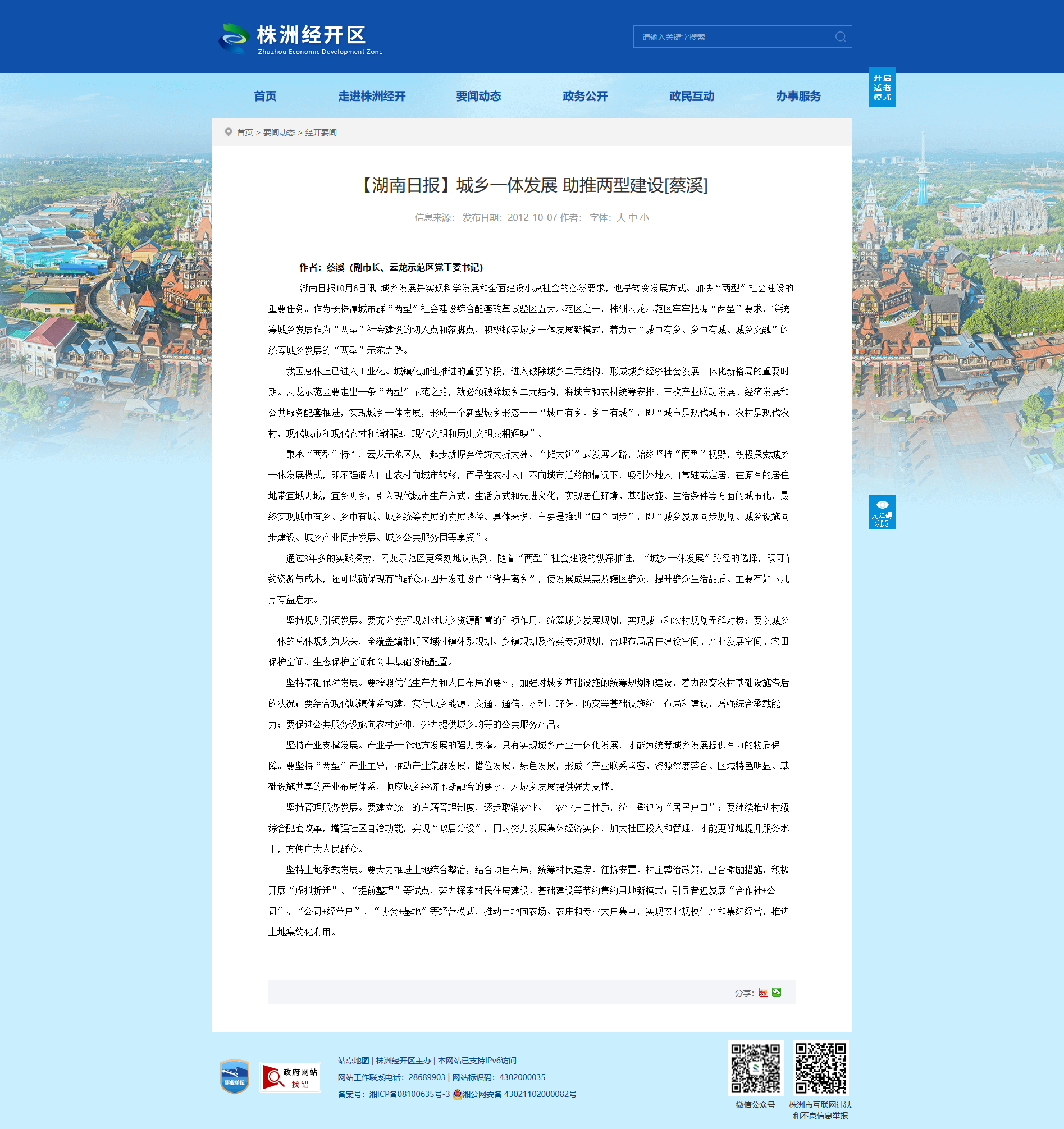 湖南日报10月6日讯 城乡发展是实现科学发展和全面建设小康社会的必然要求,也是转变发展方式、加快“两型”社会建设的重要任务。作为长株潭城市群“两型”社会建设综合配套改革试验区五大示范区之一,株洲云龙示范区牢牢把握“两型”要求,将统筹城乡发展作为“两型”社会建设的切入点和落脚点,积极探索城乡一体发展新模式,着力走“城中有乡、乡中有城、城乡交融”的统筹城乡发展的“两型”示范之路。