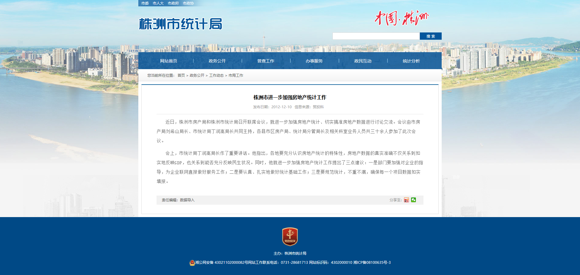 近日,株洲市房产局和株洲市统计局召开联席会议,就进一步加强房地产统计、切实搞准房地产数据进行讨论交流。会议由市房产局刘希山局长、市统计局丁润高局长共同主持,各县市区房产局、统计局分管局长及相关科室业务人员共三十余人参加了此次会议。