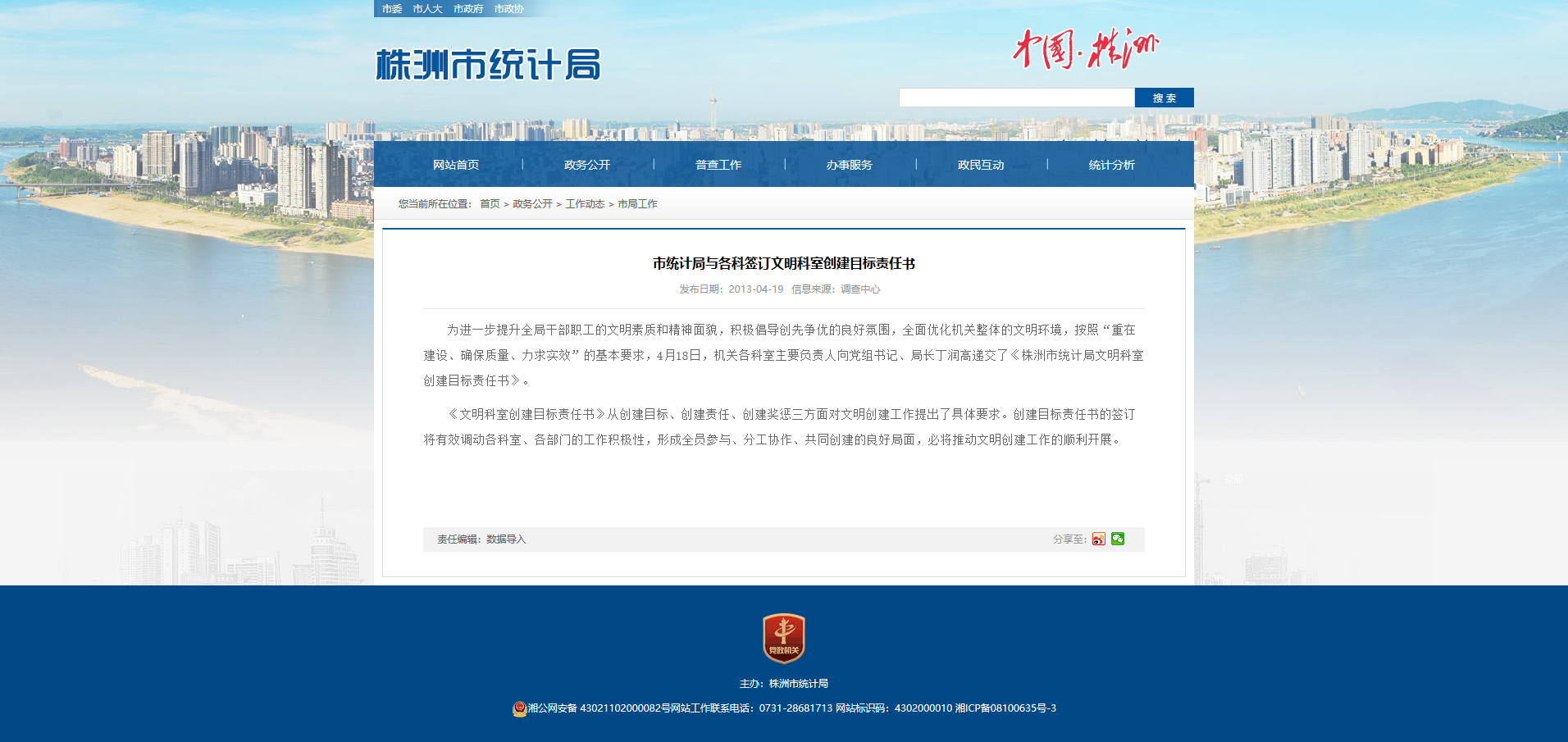 为进一步提升全局干部职工的文明素质和精神面貌,积极倡导创先争优的良好氛围,全面优化机关整体的文明环境,按照“重在建设、确保质量、力求实效”的基本要求,4月18日,机关各科室主要负责人向党组书记、局长丁润高递交了《株洲市统计局文明科室创建目标责任书》。
