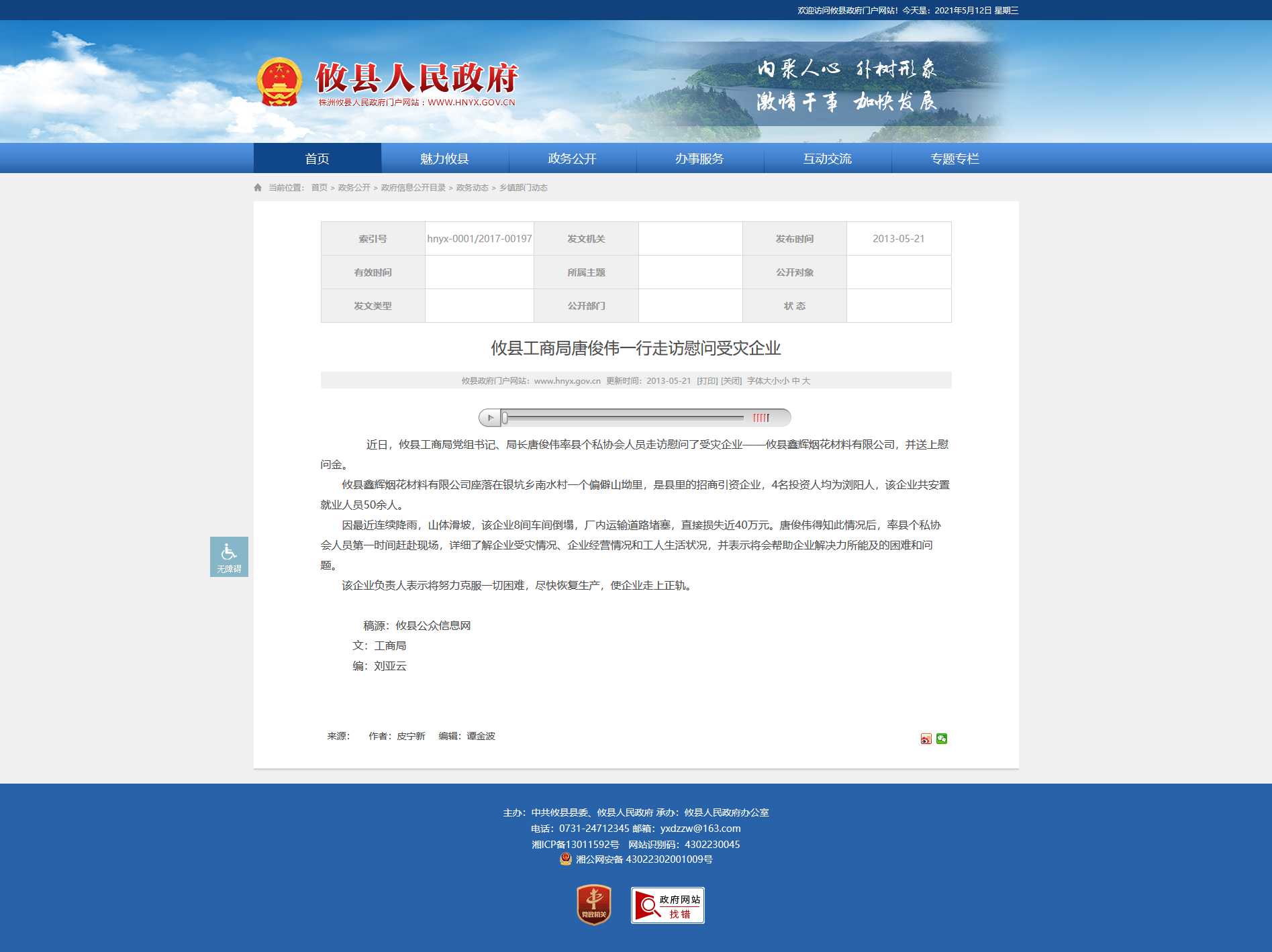 近日,攸县工商局党组书记、局长唐俊伟率县个私协会人员走访慰问了受灾企业——攸县鑫辉烟花材料有限公司,并送上慰问金。