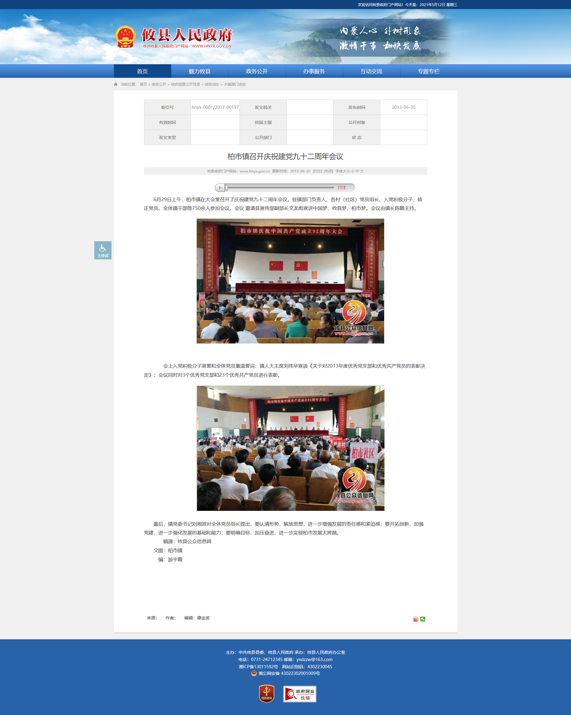 6月29日上午,柏市镇在大会堂召开了庆祝建党九十二周年会议。驻镇部门负责人、各村(社区)党员组长、入党积极分子、转正党员、全体镇干部等750余人参加会议。会议邀请县宣传部副部长文龙彪宣讲中国梦、攸县梦、柏市梦。会议由镇长陈鹏主持。