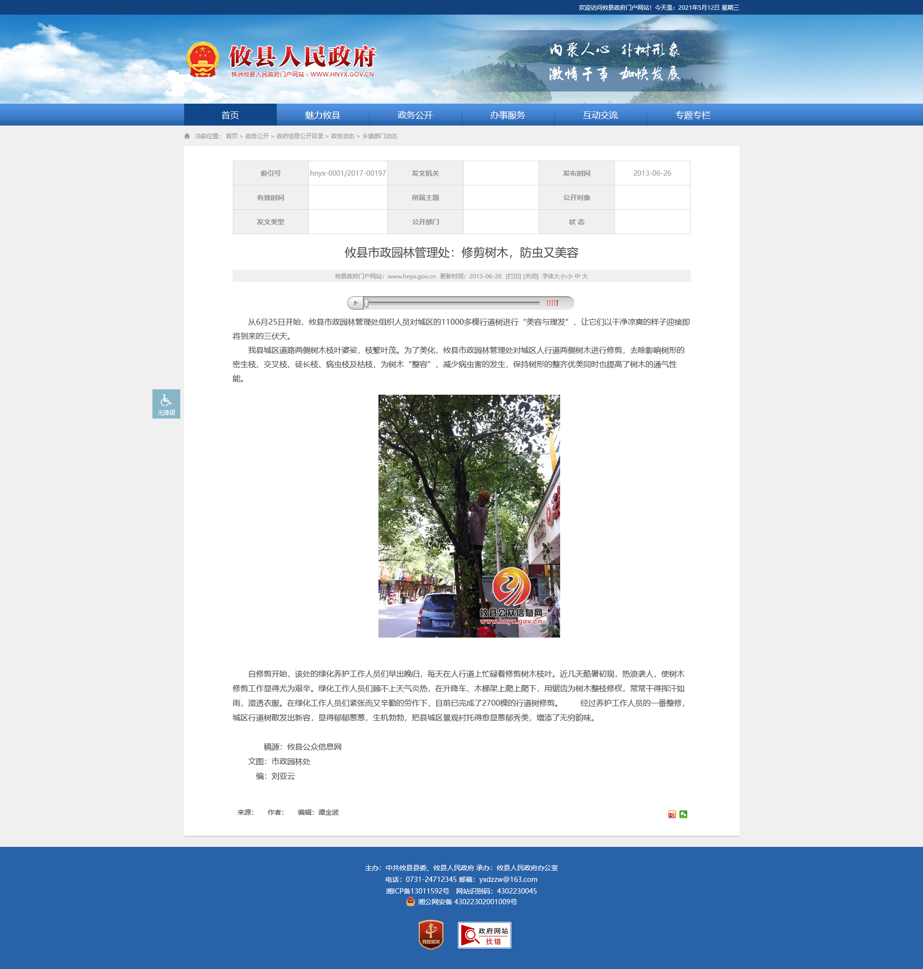 自修剪开始,该处的绿化养护工作人员们早出晚归,每天在人行道上忙碌着修剪树木枝叶。近几天酷暑初现,热浪袭人,使树木修剪工作显得尤为艰辛。绿化工作人员们顾不上天气炎热,在升降车、木梯架上爬上爬下,用锯齿为树木整枝修杈,常常干得挥汗如雨,湿透衣服。在绿化工作人员们紧张而又辛勤的劳作下,目前已完成了2700棵的行道树修剪。 经过养护工作人员的一番整修,城区行道树散发出新容,显得郁郁葱葱,生机勃勃,把县城区景观衬托得愈显葱郁秀美,增添了无穷韵味。