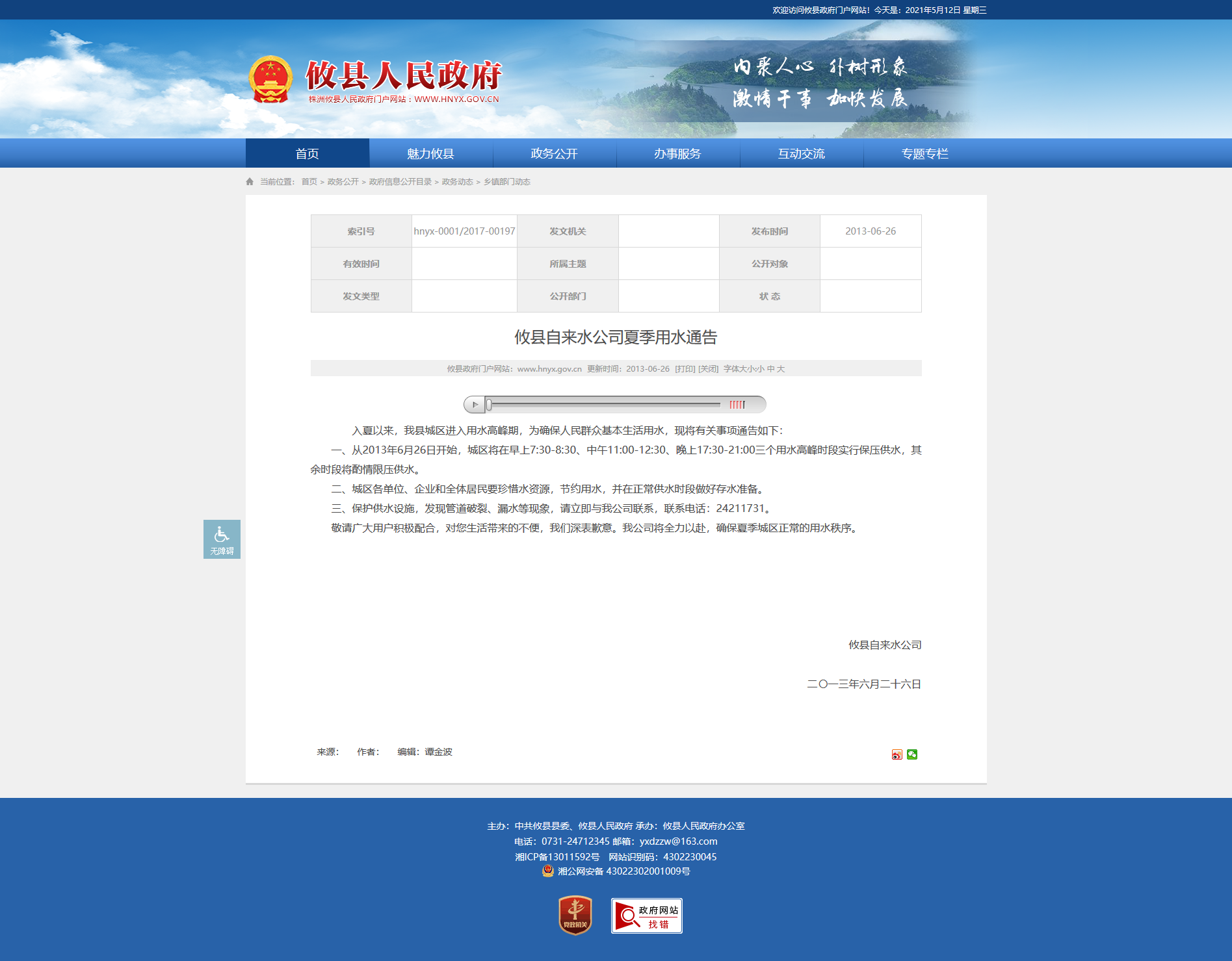 一、从2013年6月26日开始,城区将在早上7:30-8:30、中午11:00-12:30、晚上17:30-21:00三个用水高峰时段实行保压供水,其余时段将酌情限压供水。