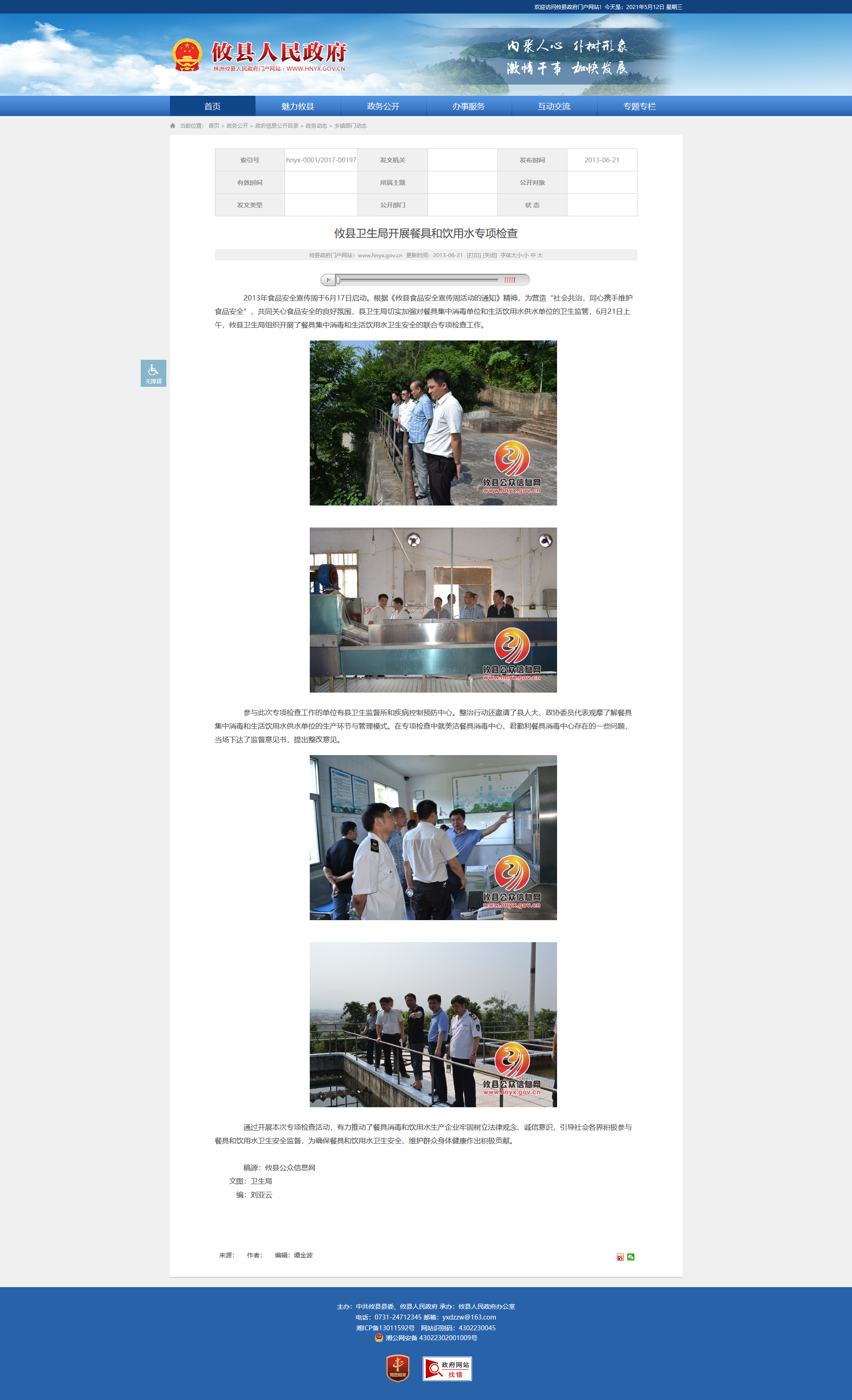 2013年食品安全宣传周于6月17日启动。根据《攸县食品安全宣传周活动的通知》精神,为营造“社会共治,同心携手维护食品安全”,共同关心食品安全的良好氛围,县卫生局切实加强对餐具集中消毒单位和生活饮用水供水单位的卫生监管,6月21日上午,攸县卫生局组织开展了餐具集中消毒和生活饮用水卫生安全的联合专项检查工作。