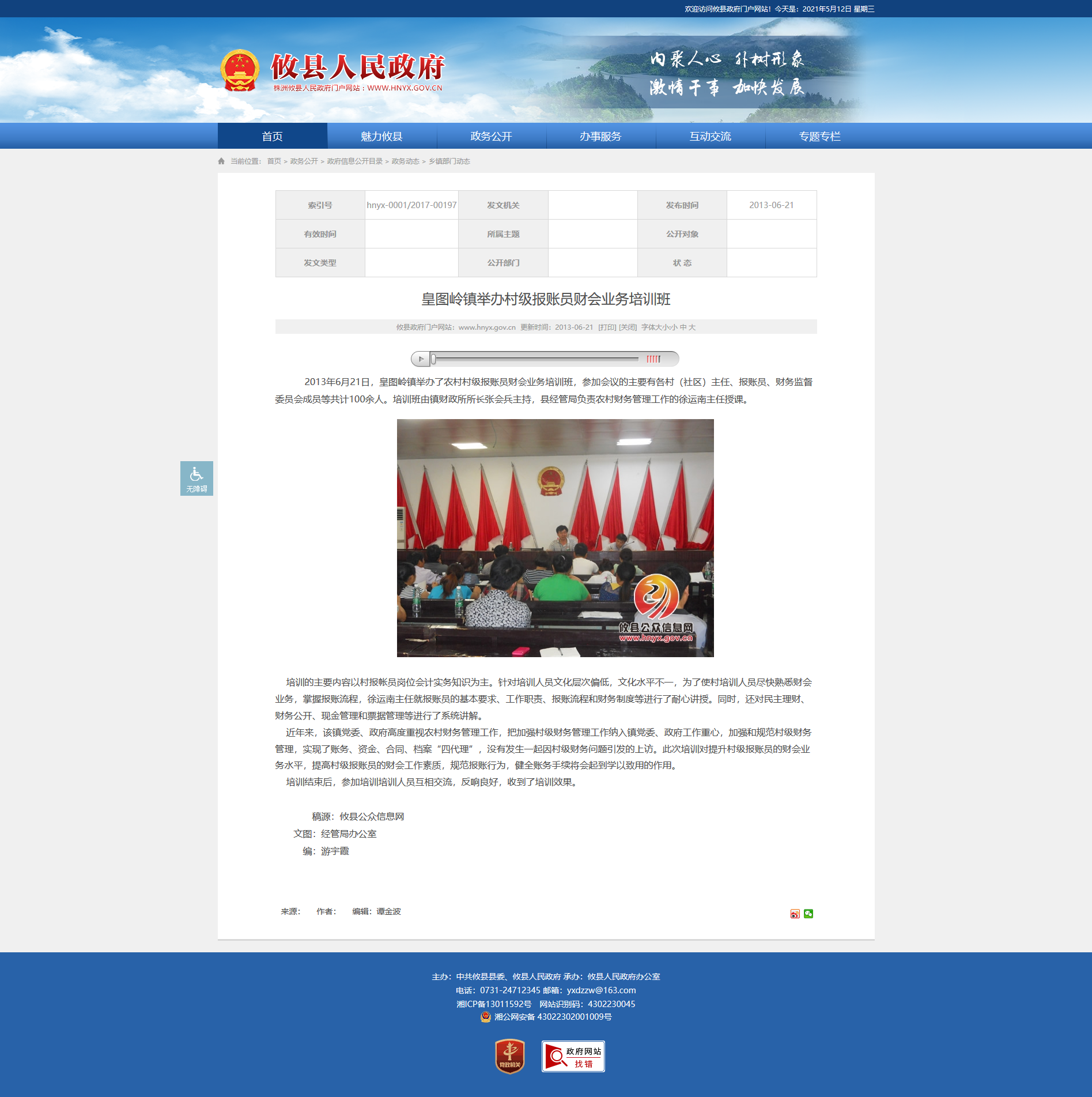 2013年6月21日,皇图岭镇举办了农村村级报账员财会业务培训班,参加会议的主要有各村(社区)主任、报账员、财务监督委员会成员等共计100余人。培训班由镇财政所所长张会兵主持,县经管局负责农村财务管理工作的徐运南主任授课。