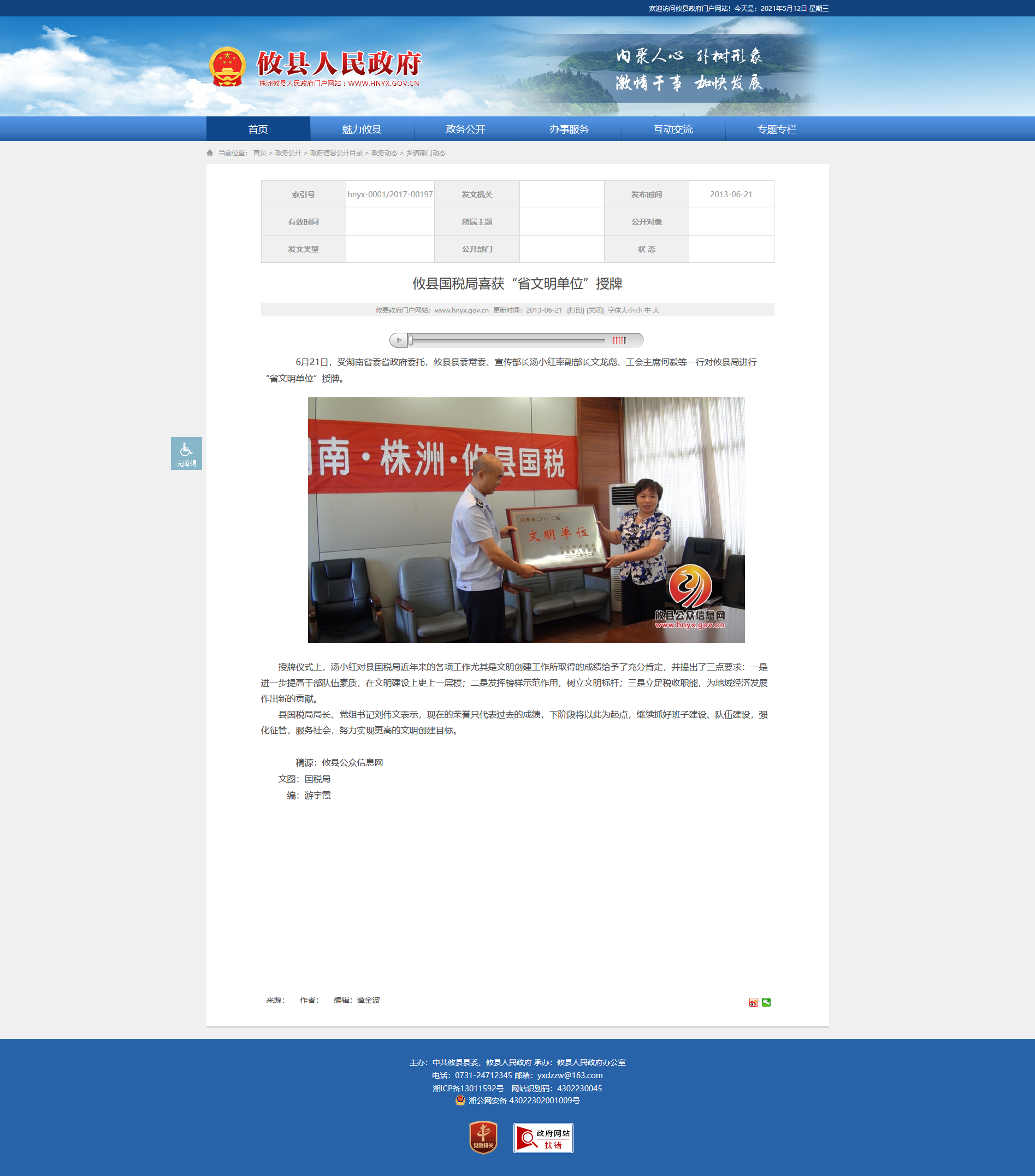 6月21日,受湖南省委省政府委托,攸县县委常委、宣传部长汤小红率副部长文龙彪、工会主席何毅等一行对攸县局进行“省文明单位”授牌。