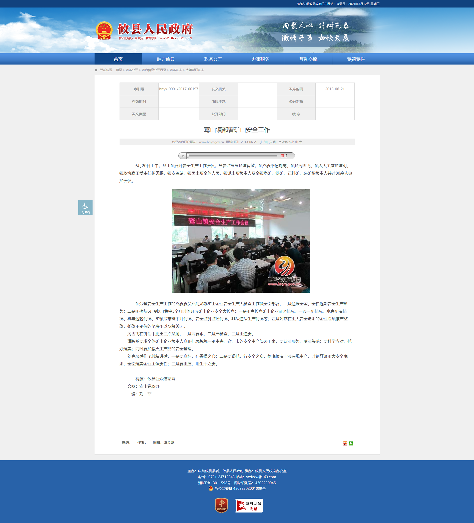 6月20日上午,鸾山镇召开安全生产工作会议,县安监局局长谭智敏,镇党委书记刘亮、镇长周雪飞、镇人大主席翟谭明、镇政协联工委主任杨勇鹏,镇安监站、镇国土所全体人员,镇派出所负责人及全镇煤矿、铁矿、石料矿、选矿场负责人共计80余人参加会议。