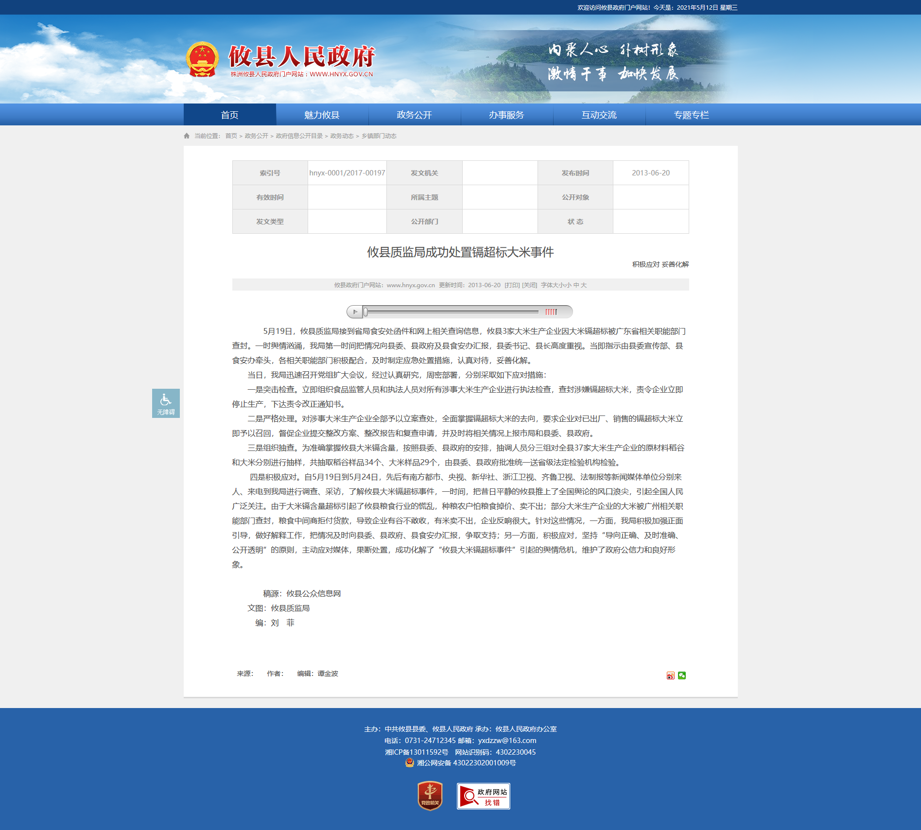 5月19日,攸县质监局接到省局食安处函件和网上相关查询信息,攸县3家大米生产企业因大米镉超标被广东省相关职能部门查封。一时舆情汹涌,我局第一时间把情况向县委、县政府及县食安办汇报,县委书记、县长高度重视。当即指示由县委宣传部、县食安办牵头,各相关职能部门积极配合,及时制定应急处置措施,认真对待,妥善化解。