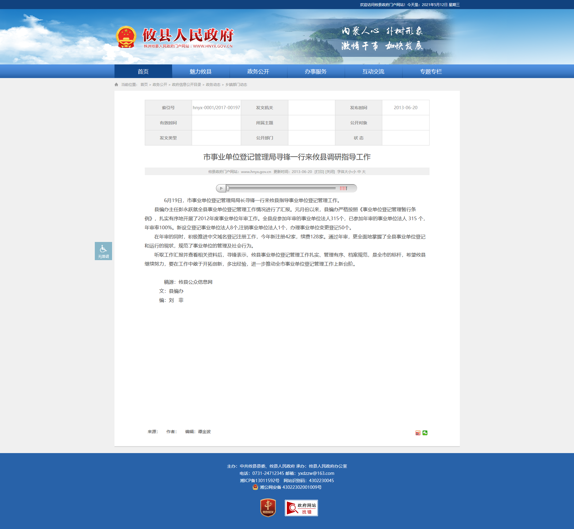 6月19日,市事业单位登记管理局局长寻锋一行来攸县指导事业单位登记管理工作。