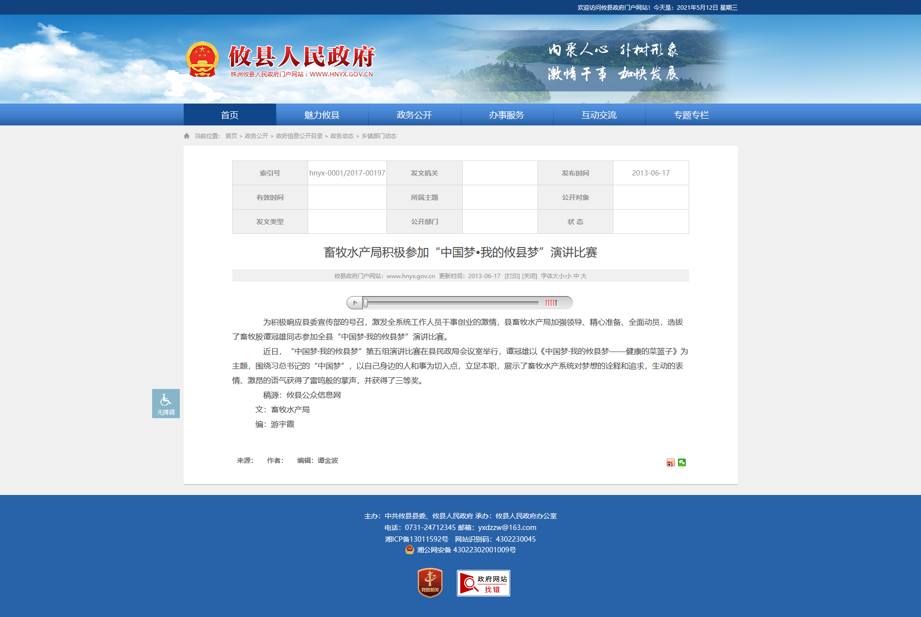 为积极响应县委宣传部的号召,激发全系统工作人员干事创业的激情,县畜牧水产局加强领导、精心准备、全面动员,选拔了畜牧股谭冠雄同志参加全县“中国梦·我的攸县梦”演讲比赛。