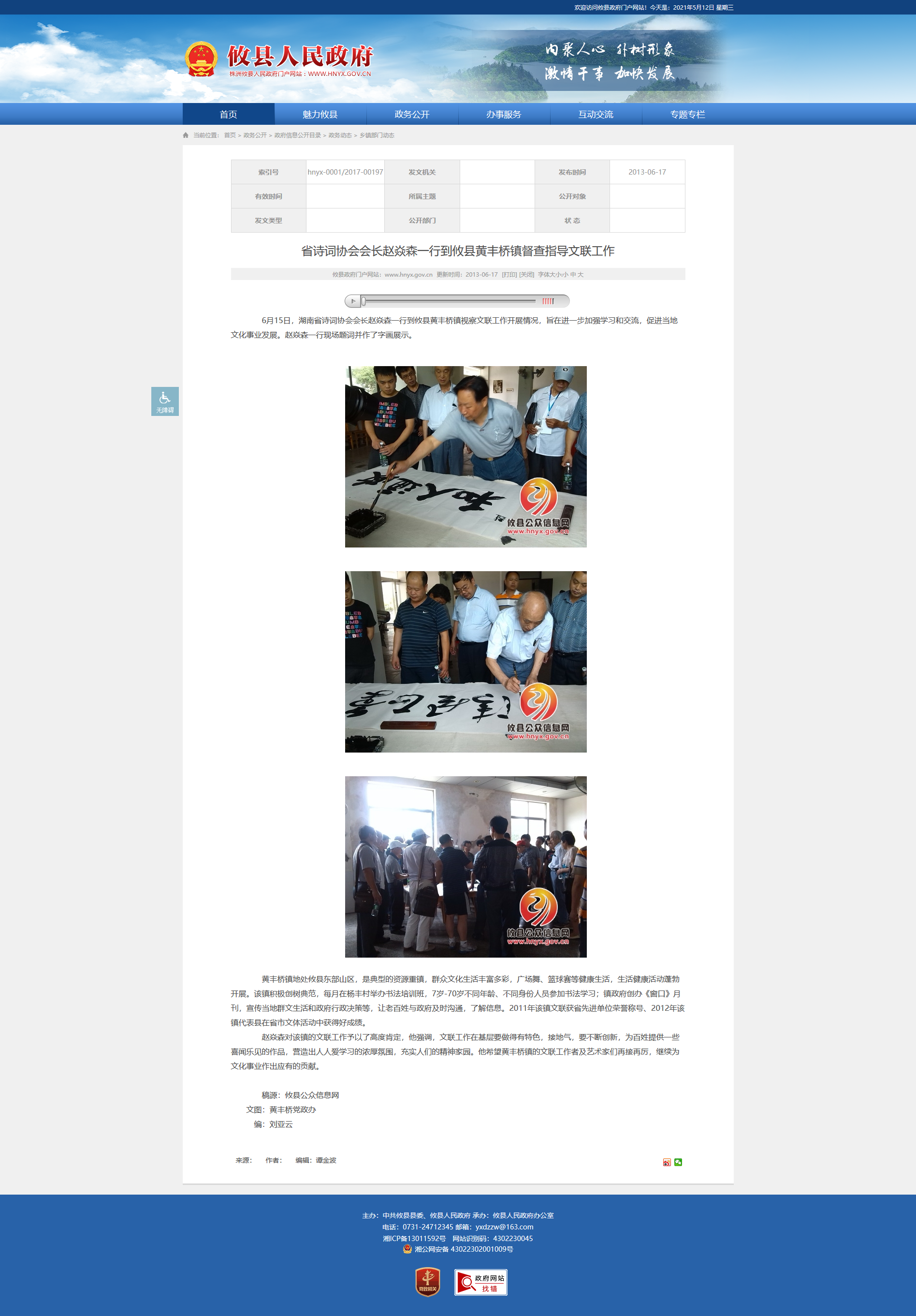 6月15日,湖南省诗词协会会长赵焱森一行到攸县黄丰桥镇视察文联工作开展情况,旨在进一步加强学习和交流,促进当地文化事业发展。赵焱森一行现场题词并作了字画展示。