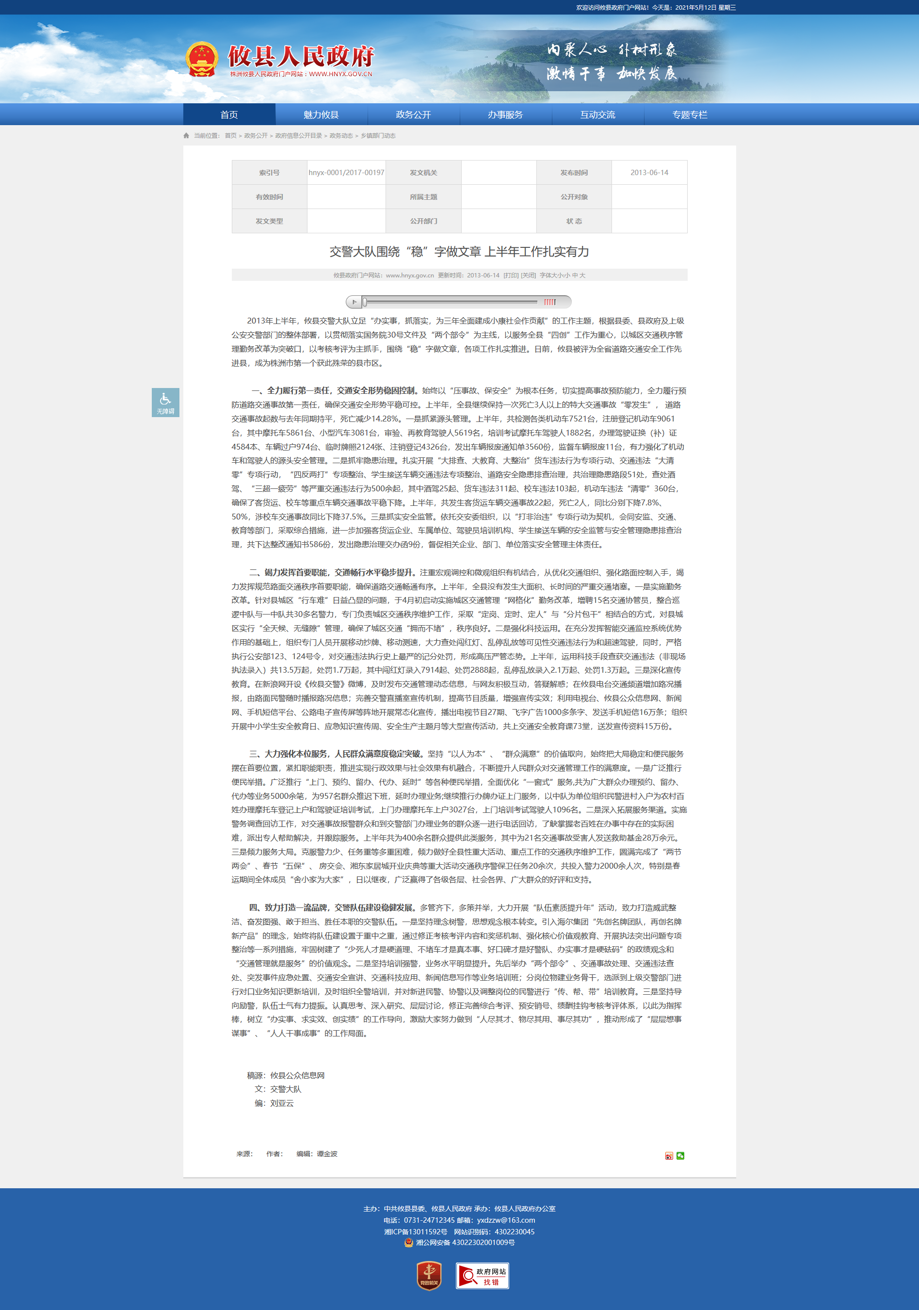 2013年上半年,攸县交警大队立足“办实事,抓落实,为三年全面建成小康社会作贡献”的工作主题,根据县委、县政府及上级公安交警部门的整体部署,以贯彻落实国务院30号文件及“两个部令”为主线,以服务全县“四创”工作为重心,以城区交通秩序管理勤务改革为突破口,以考核考评为主抓手,围绕“稳”字做文章,各项工作扎实推进。日前,攸县被评为全省道路交通安全工作先进县,成为株洲市第一个获此殊荣的县市区。