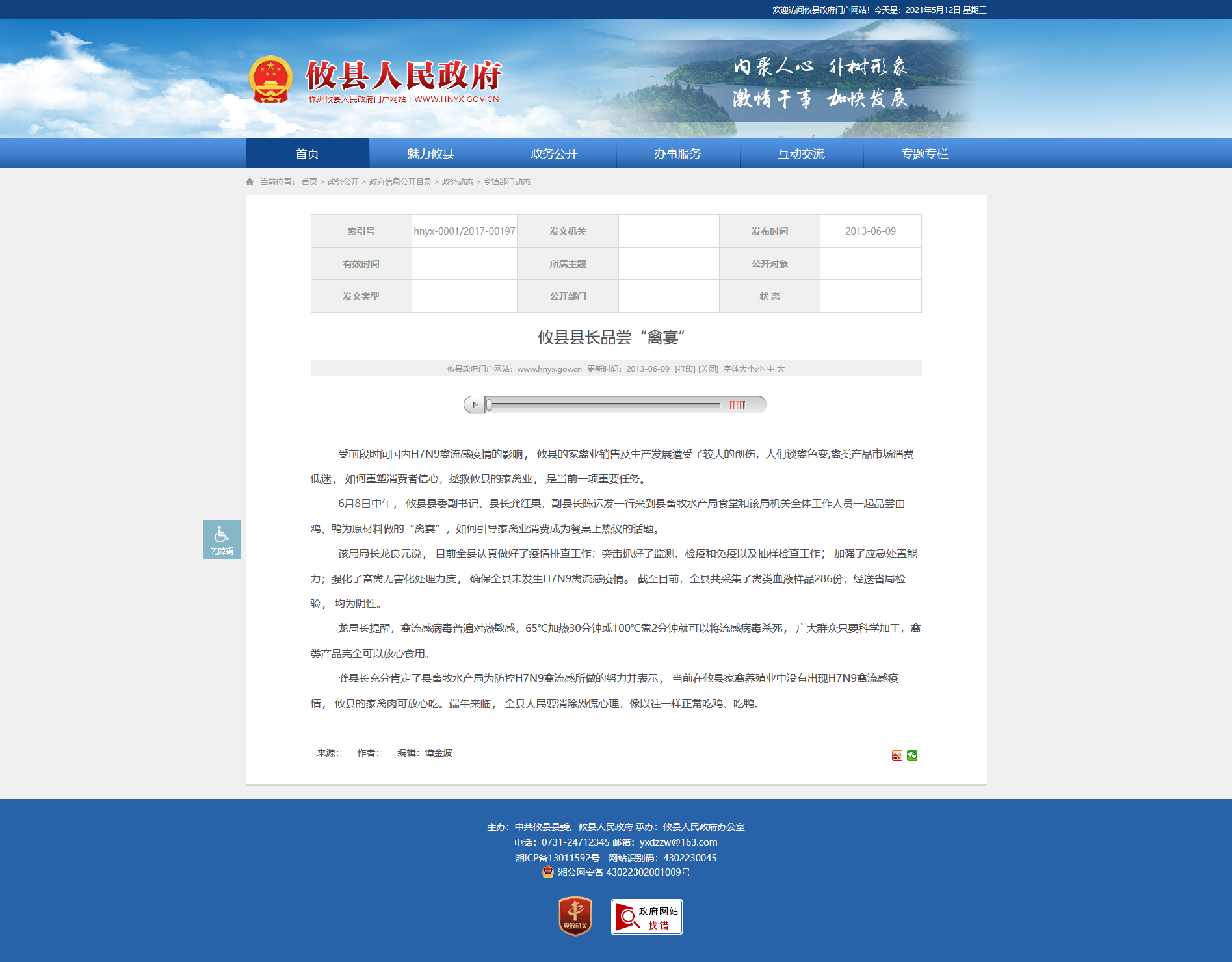 龚县长充分肯定了县畜牧水产局为防控H7N9禽流感所做的努力并表示,当前在攸县家禽养殖业中没有出现H7N9禽流感疫情,攸县的家禽肉可放心吃。端午来临,全县人民要消除恐慌心理,像以往一样正常吃鸡、吃鸭。