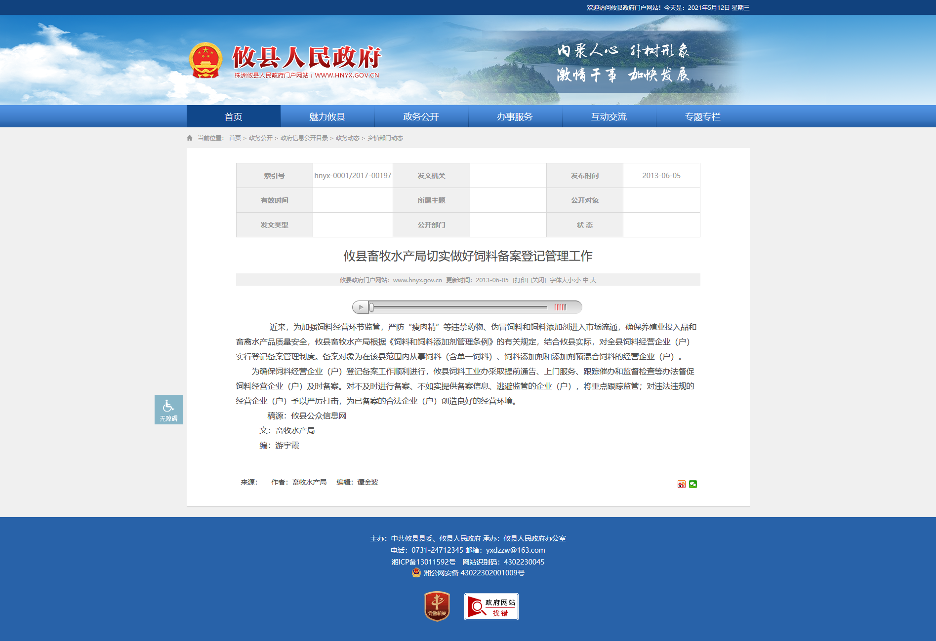 近来,为加强饲料经营环节监管,严防“瘦肉精”等违禁药物、伪冒饲料和饲料添加剂进入市场流通,确保养殖业投入品和畜禽水产品质量安全,攸县畜牧水产局根据《饲料和饲料添加剂管理条例》的有关规定,结合攸县实际,对全县饲料经营企业(户)实行登记备案管理制度。备案对象为在该县范围内从事饲料(含单一饲料)、饲料添加剂和添加剂预混合饲料的经营企业(户)。