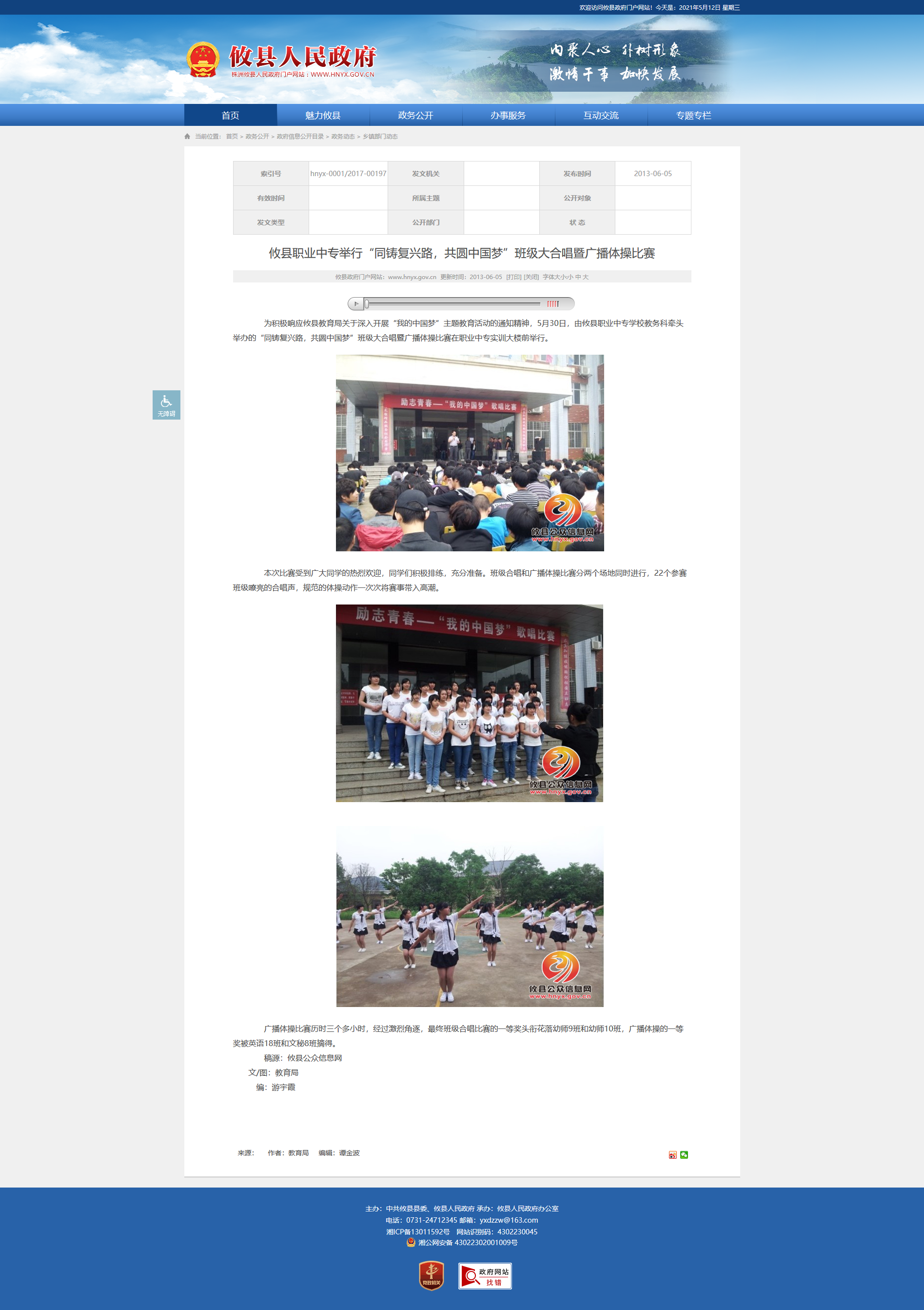 为积极响应攸县教育局关于深入开展“我的中国梦”主题教育活动的通知精神,5月30日,由攸县职业中专学校教务科牵头举办的“同铸复兴路,共圆中国梦”班级大合唱暨广播体操比赛在职业中专实训大楼前举行。
