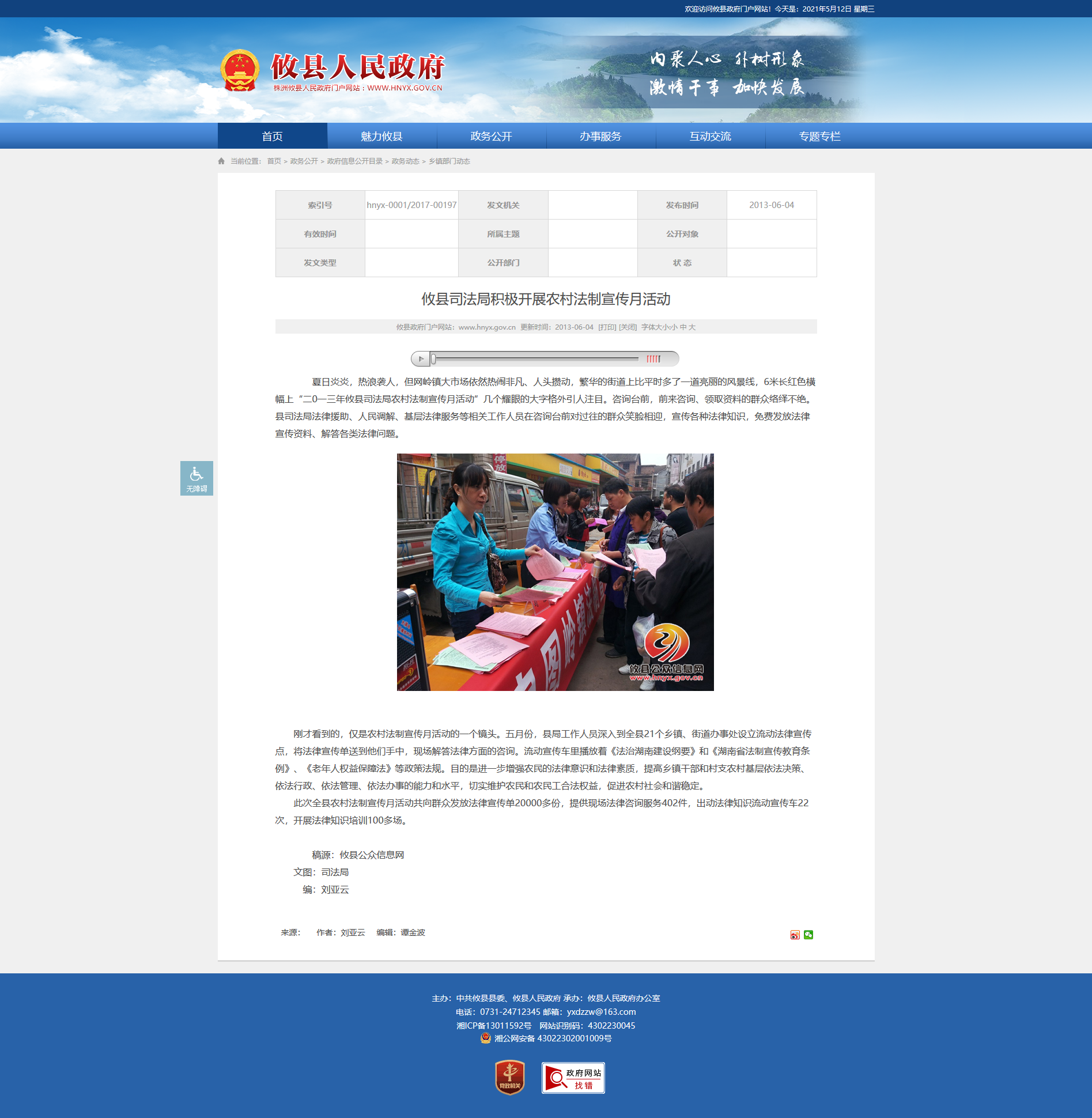 刚才看到的,仅是农村法制宣传月活动的一个镜头。五月份,县局工作人员深入到全县21个乡镇、街道办事处设立流动法律宣传点,将法律宣传单送到他们手中,现场解答法律方面的咨询。流动宣传车里播放着《法治湖南建设纲要》和《湖南省法制宣传教育条例》、《老年人权益保障法》等政策法规。目的是进一步增强农民的法律意识和法律素质,提高乡镇干部和村支农村基层依法决策、依法行政、依法管理、依法办事的能力和水平,切实维护农民和农民工合法权益,促进农村社会和谐稳定。