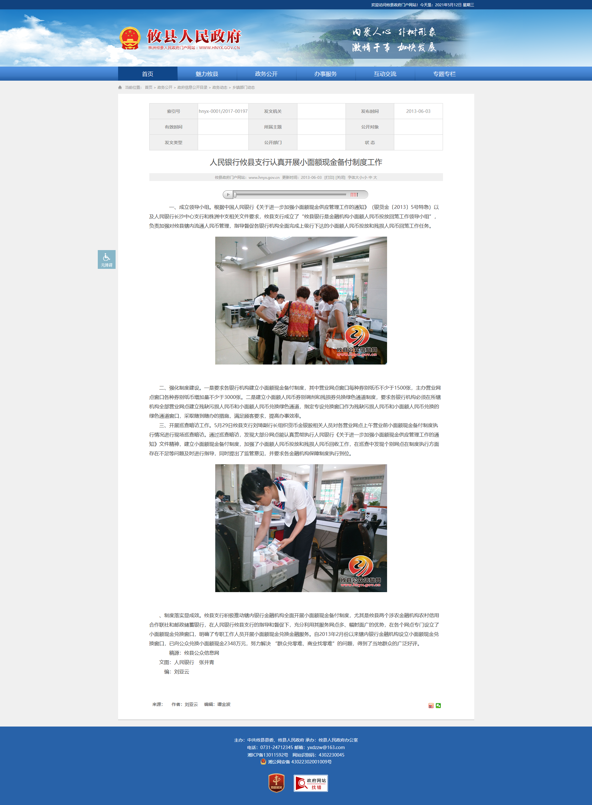 、制度落实显成效。攸县支行积极推动辖内银行金融机构全面开展小面额现金备付制度,尤其是攸县两个涉农金融机构农村信用合作联社和邮政储蓄银行,在人民银行攸县支行的指导和督促下,充分利用其服务网点多、幅射面广的优势,在各个网点专门设立了小面额现金兑换窗口,明确了专职工作人员开展小面额现金兑换金融服务。自2013年2月份以来辖内银行金融机构设立小面额现金兑换窗口,已向公众兑换小面额现金2348万元,努力解决 “群众兑零难、商业找零难”的问题,得到了当地群众的广泛好评。