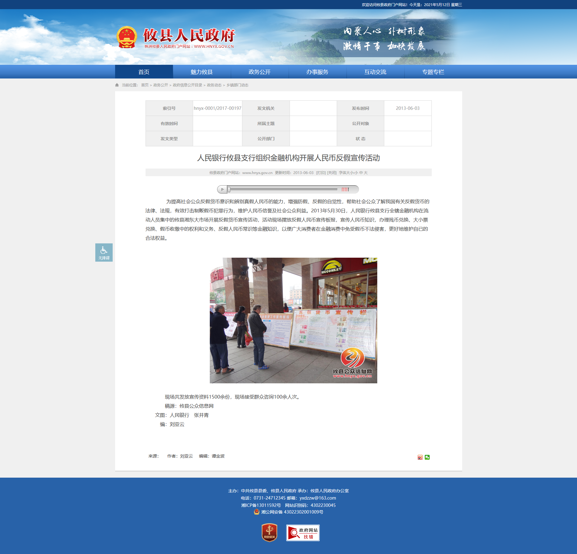 为提高社会公众反假货币意识和辨别真假人民币的能力,增强防假、反假的自觉性,帮助社会公众了解我国有关反假货币的法律、法规,有效打击制贩假币犯罪行为,维护人民币信誉及社会公众利益。2013年5月30日,人民银行攸县支行全辖金融机构在流动人员集中的攸县湘东大市场开展反假货币宣传活动,活动现场摆放反假人民币宣传板报,宣传人民币知识,办理残币兑换、大小票兑换、假币收缴中的权利和义务、反假人民币常识等金融知识,以便广大消费者在金融消费中免受假币不法侵害,更好地维护自已的合法权益。