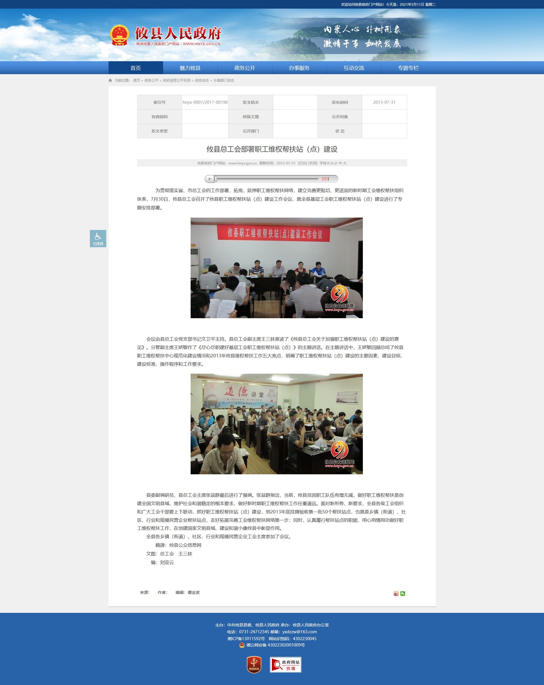 会议由县总工会党支部书记文卫平主持。县总工会副主席王三林宣读了《攸县总工会关于加强职工维权帮扶站(点)建设的意见》。分管副主席王娇敏作了《尽心尽职建好基层工会职工维权帮扶站(点)》的主题讲话。在主题讲话中,王娇敏回顾总结了攸县职工维权帮扶中心规范化建设情况和2013年攸县维权帮扶工作五大亮点,明确了职工维权帮扶站(点)建设的主要因素、建设目标、建设标准、操作程序和工作要求。