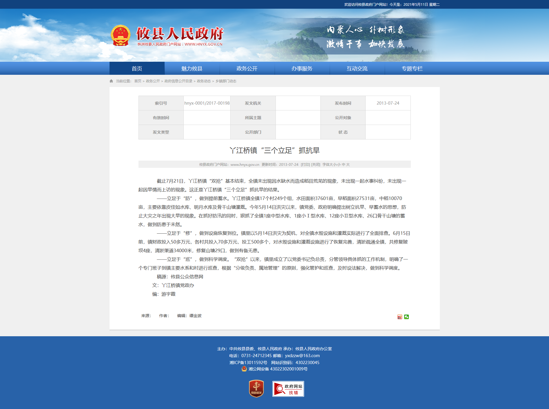 截止7月21日,丫江桥镇“双抢”基本结束,全镇未出现因水缺水而造成稻田荒芜的现象,未出现一起水事纠纷,未出现一起因旱情而上访的现象。这正是丫江桥镇“三个立足”抓抗旱的结果。