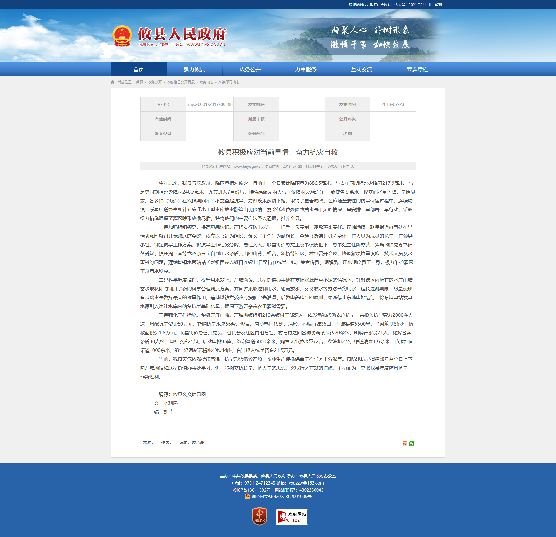 当前,我县天气依然持续高温,抗旱形势仍较严峻,农业生产保插保苗工作任务十分艰巨。县防汛抗旱指挥部号召全县上下向莲塘坳镇和联星街道办事处学习,进一步树立抗长旱、抗大旱的思想,采取行之有效的措施,主动而为,夺取我县年度防汛抗旱工作新胜利。