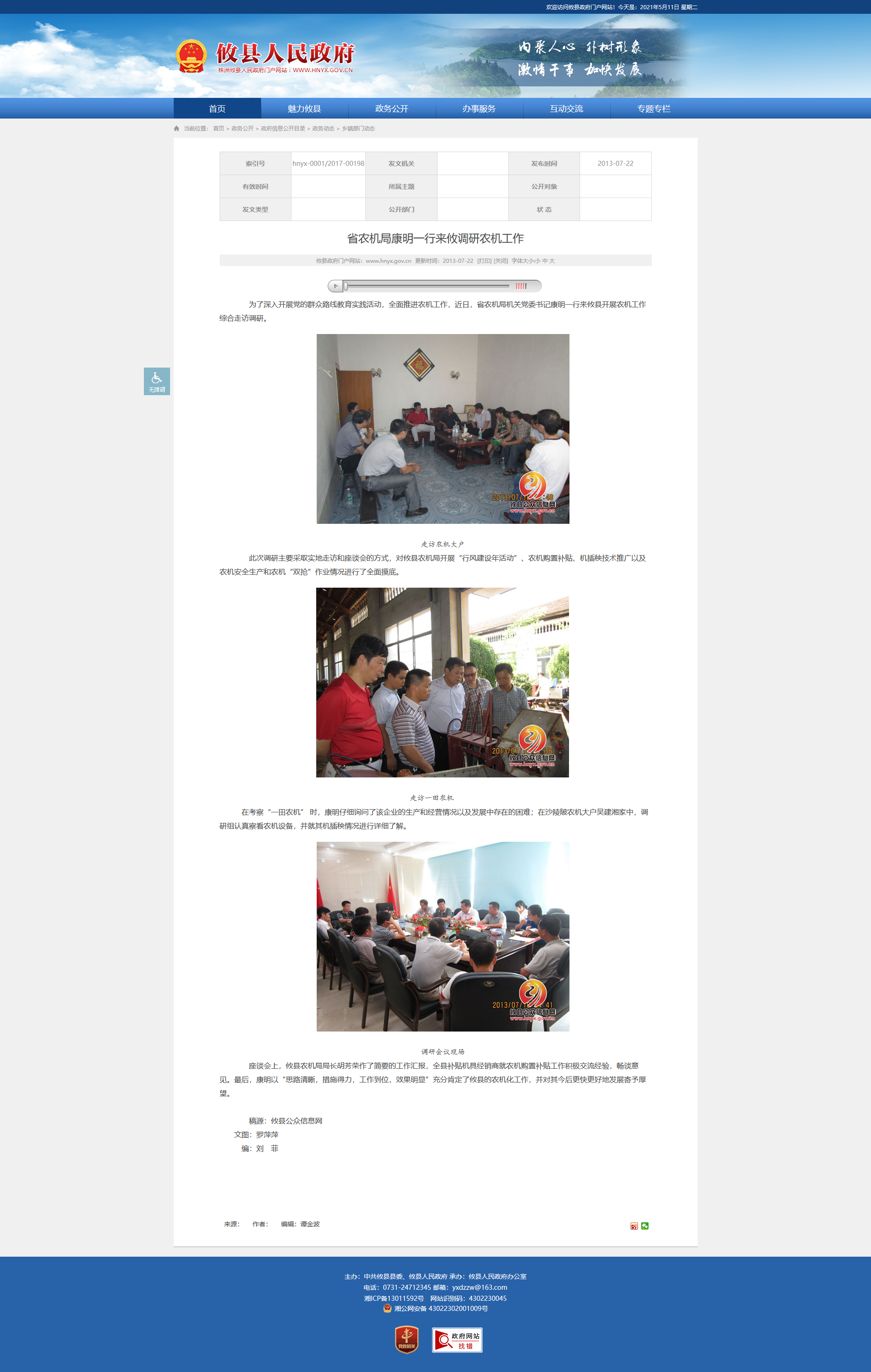 为了深入开展党的群众路线教育实践活动,全面推进农机工作,近日,省农机局机关党委书记康明一行来攸县开展农机工作综合走访调研。