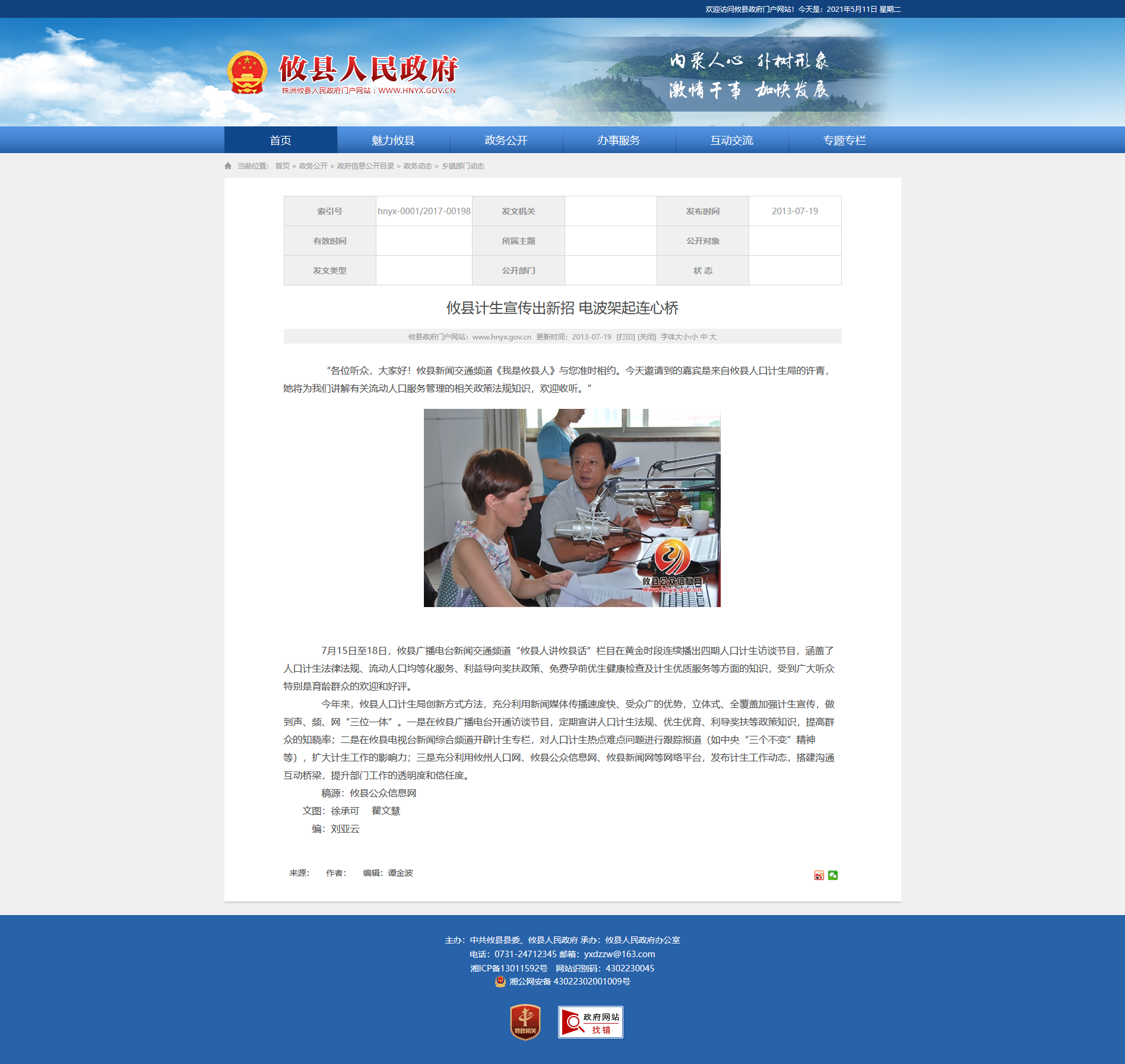 今年来,攸县人口计生局创新方式方法,充分利用新闻媒体传播速度快、受众广的优势,立体式、全覆盖加强计生宣传,做到声、频、网“三位一体”。一是在攸县广播电台开通访谈节目,定期宣讲人口计生法规、优生优育、利导奖扶等政策知识,提高群众的知晓率;二是在攸县电视台新闻综合频道开辟计生专栏,对人口计生热点难点问题进行跟踪报道(如中央“三个不变”精神等),扩大计生工作的影响力;三是充分利用攸州人口网、攸县公众信息网、攸县新闻网等网络平台,发布计生工作动态,搭建沟通互动桥梁,提升部门工作的透明度和信任度。