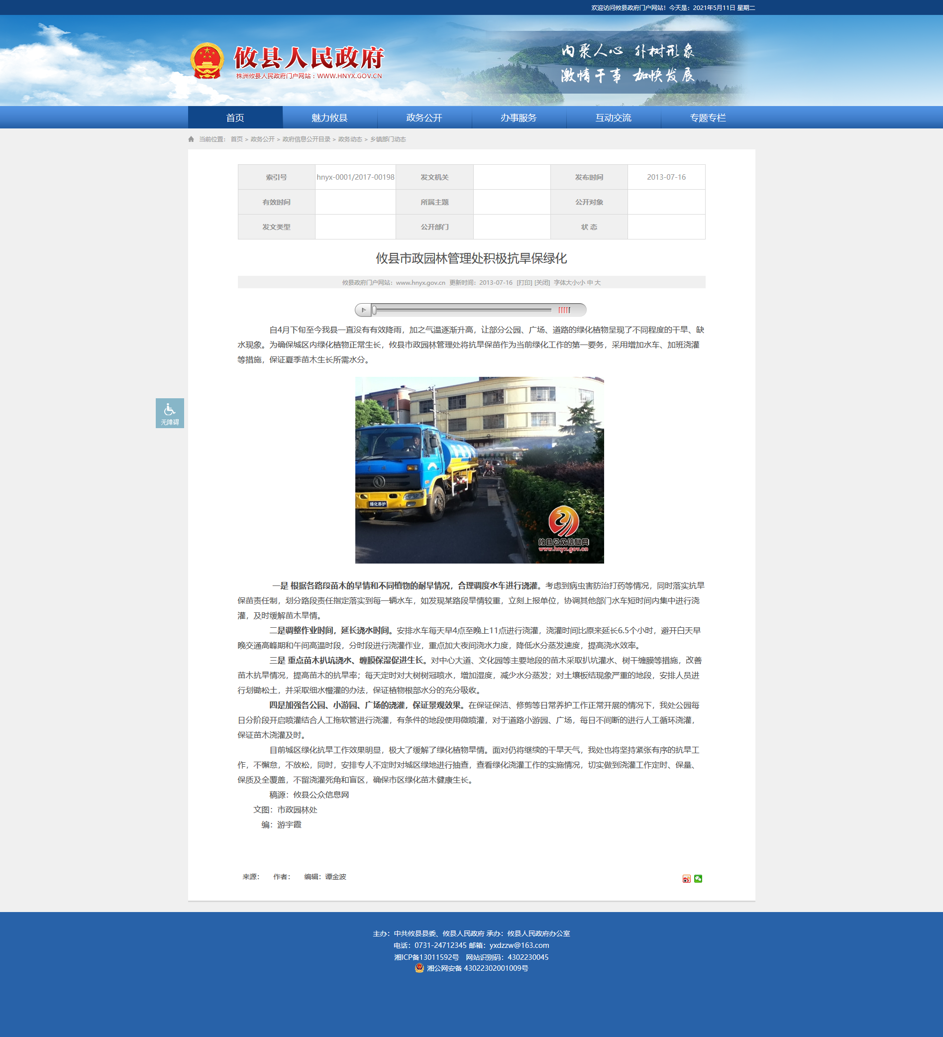 自4月下旬至今我县一直没有有效降雨,加之气温逐渐升高,让部分公园、广场、道路的绿化植物呈现了不同程度的干旱、缺水现象。为确保城区内绿化植物正常生长,攸县市政园林管理处将抗旱保苗作为当前绿化工作的第一要务,采用增加水车、加班浇灌等措施,保证夏季苗木生长所需水分。
