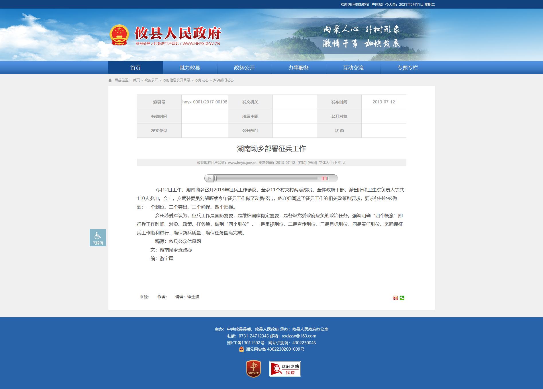 7月12日上午,湖南坳乡召开2013年征兵工作会议,全乡11个村支村两委成员、全体政府干部、派出所和卫生院负责人等共110人参加。会上,乡武装委员刘韶晖就今年征兵工作做了动员报告,他详细阐述了征兵工作的相关政策和要求,要求各村务必做到:一个到位、二个突出、三个确保、四个把握。