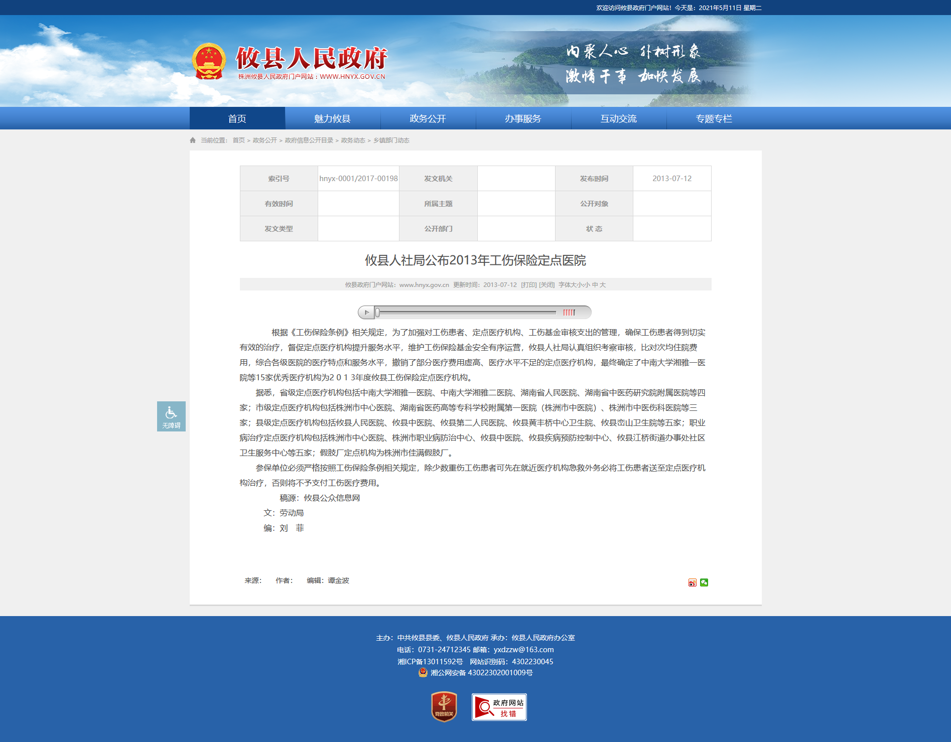 据悉,省级定点医疗机构包括中南大学湘雅一医院、中南大学湘雅二医院、湖南省人民医院、湖南省中医药研究院附属医院等四家;市级定点医疗机构包括株洲市中心医院、湖南省医药高等专科学校附属第一医院(株洲市中医院)、株洲市中医伤科医院等三家;县级定点医疗机构包括攸县人民医院、攸县中医院、攸县第二人民医院、攸县黄丰桥中心卫生院、攸县峦山卫生院等五家;职业病治疗定点医疗机构包括株洲市中心医院、株洲市职业病防治中心、攸县中医院、攸县疾病预防控制中心、攸县江桥街道办事处社区卫生服务中心等五家;假肢厂定点机构为株洲市佳满假肢厂。