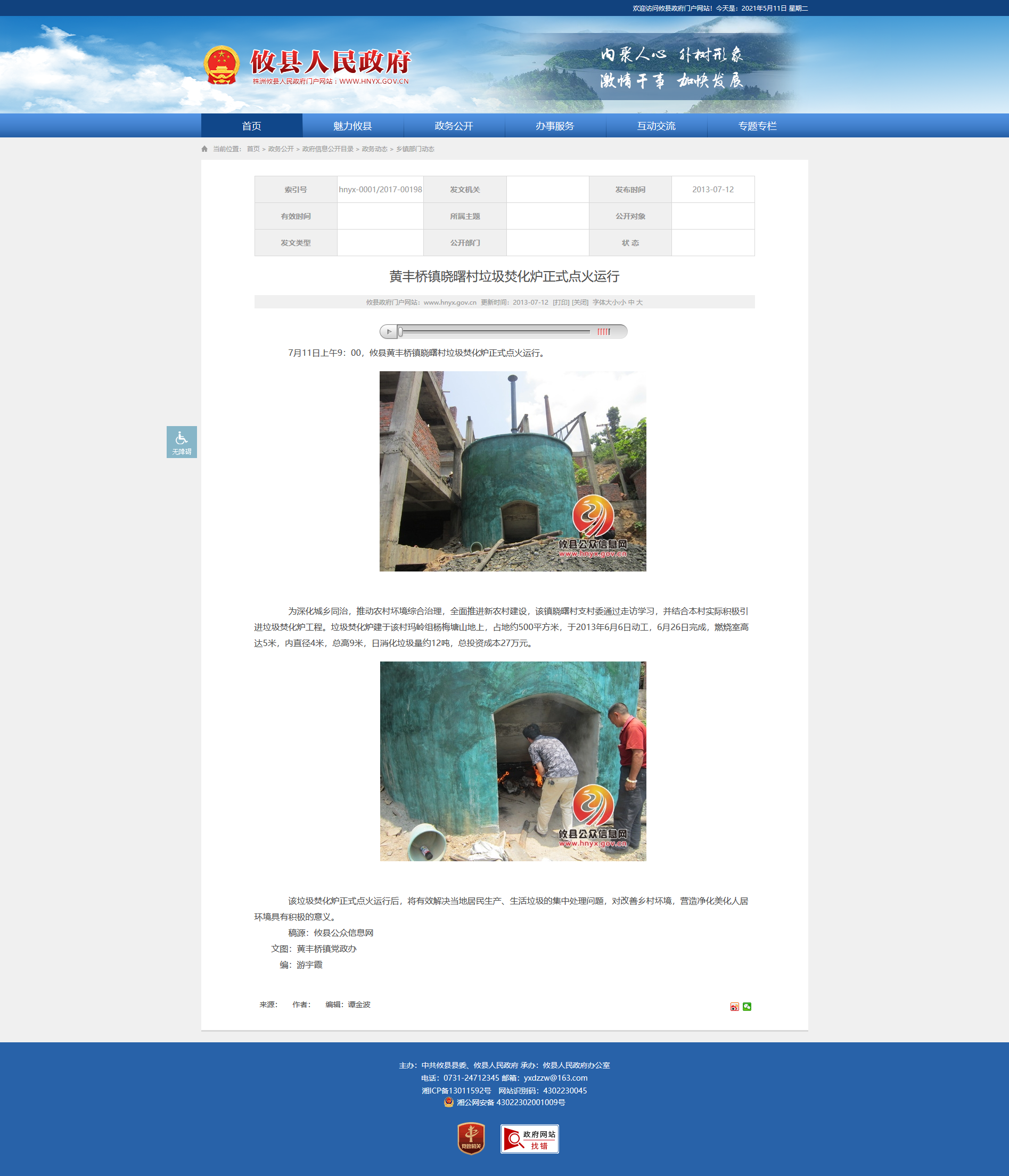 7月11日上午9:00,攸县黄丰桥镇晓曙村垃圾焚化炉正式点火运行。
