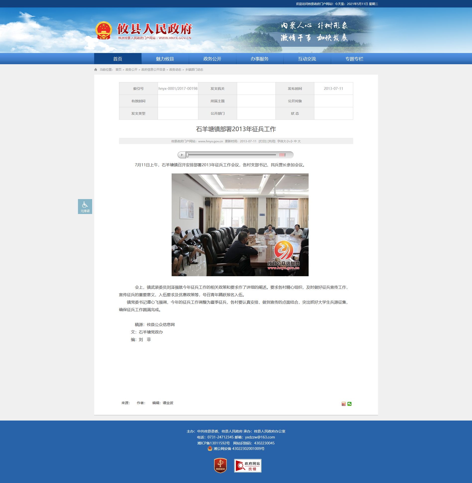7月11日上午,石羊塘镇召开安排部署2013年征兵工作会议,各村支部书记、民兵营长参加会议。
