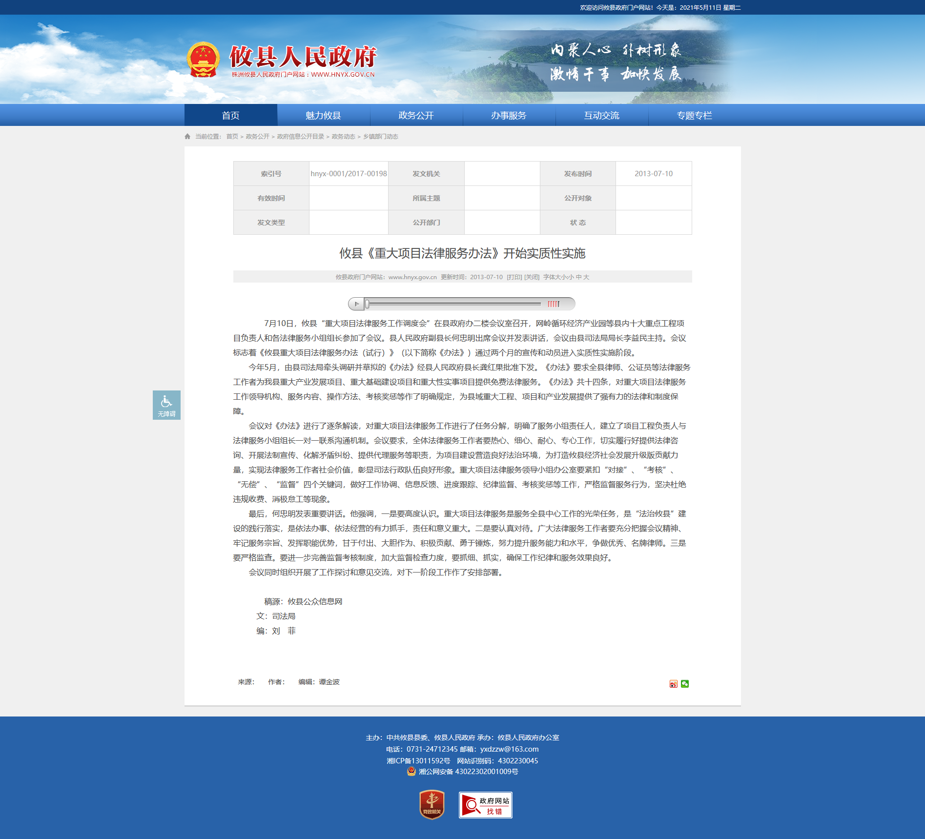 今年5月,由县司法局牵头调研并草拟的《办法》经县人民政府县长龚红果批准下发。《办法》要求全县律师、公证员等法律服务工作者为我县重大产业发展项目、重大基础建设项目和重大性实事项目提供免费法律服务。《办法》共十四条,对重大项目法律服务工作领导机构、服务内容、操作方法、考核奖惩等作了明确规定,为县域重大工程、项目和产业发展提供了强有力的法律和制度保障。