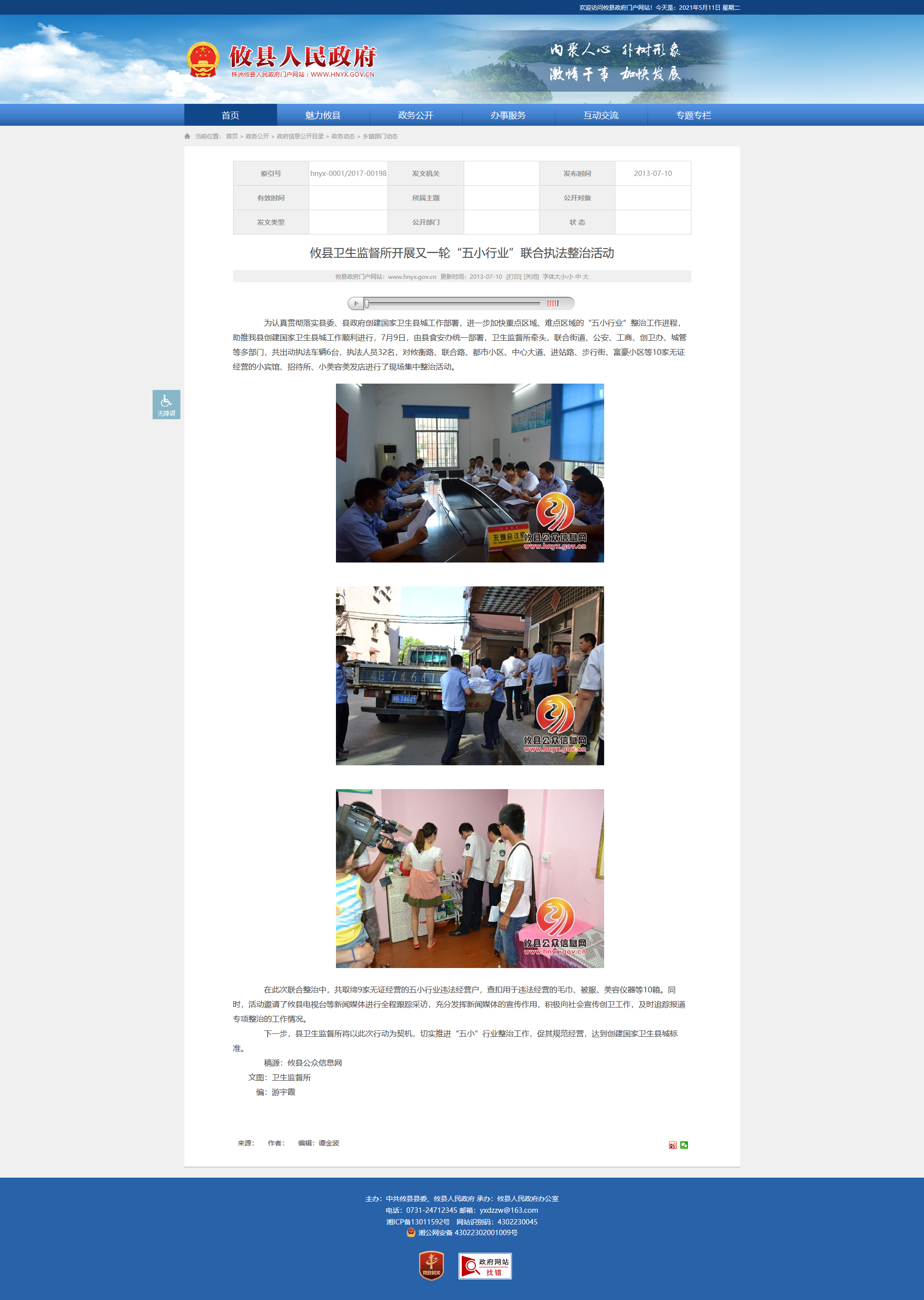 为认真贯彻落实县委、县政府创建国家卫生县城工作部署,进一步加快重点区域、难点区域的“五小行业”整治工作进程,助推我县创建国家卫生县城工作顺利进行,7月9日,由县食安办统一部署,卫生监督所牵头,联合街道、公安、工商、创卫办、城管等多部门,共出动执法车辆6台,执法人员32名,对攸衡路、联合路、都市小区、中心大道、进站路、步行街、富豪小区等10家无证经营的小宾馆、招待所、小美容美发店进行了现场集中整治活动。