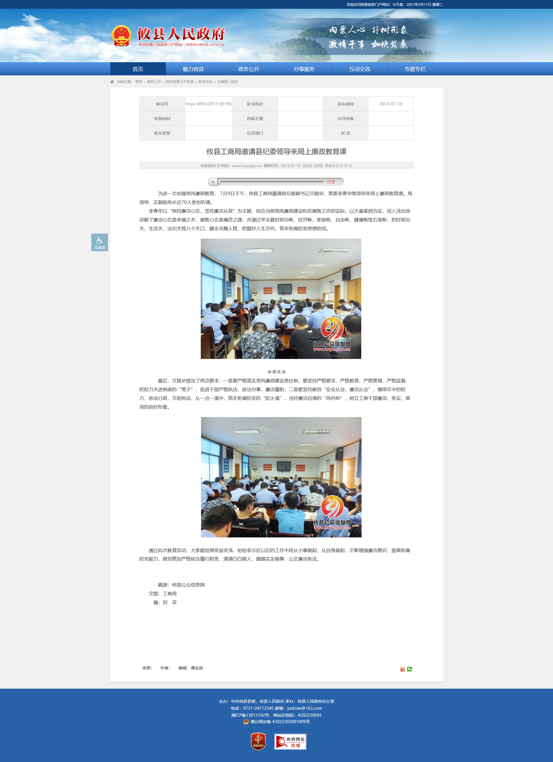 为进一步加强党风廉政教育, 7月9日下午,攸县工商局邀请县纪委副书记文晓华、常委李春华等领导来局上廉政教育课。局领导、正副股所长近70人参加听课。