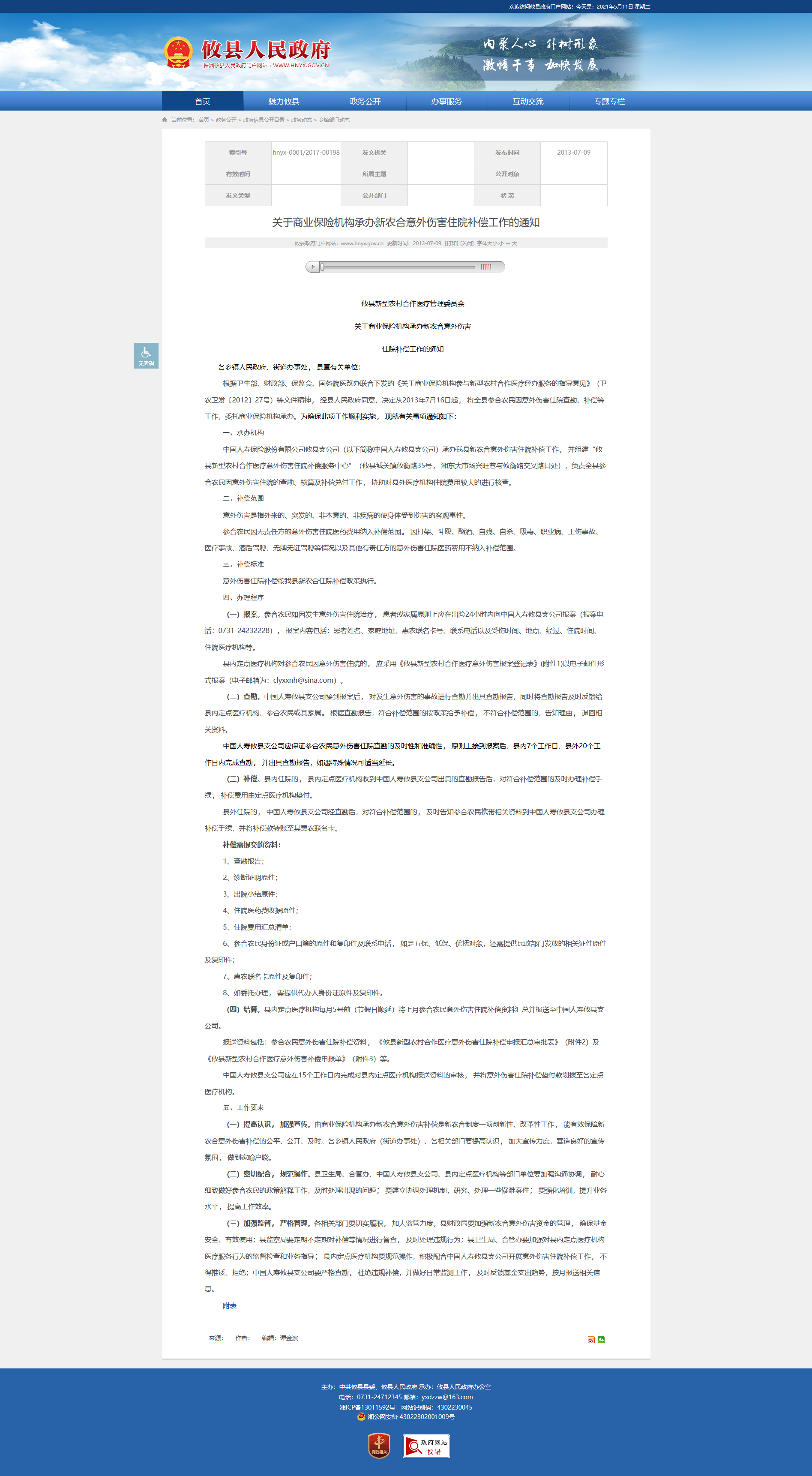 根据卫生部、财政部、保监会、国务院医改办联合下发的《关于商业保险机构参与新型农村合作医疗经办服务的指导意见》(卫农卫发〔2012〕27号)等文件精神,经县人民政府同意,决定从2013年7月16日起,将全县参合农民因意外伤害住院查勘、补偿等工作,委托商业保险机构承办。为确保此项工作顺利实施,现就有关事项通知如下: