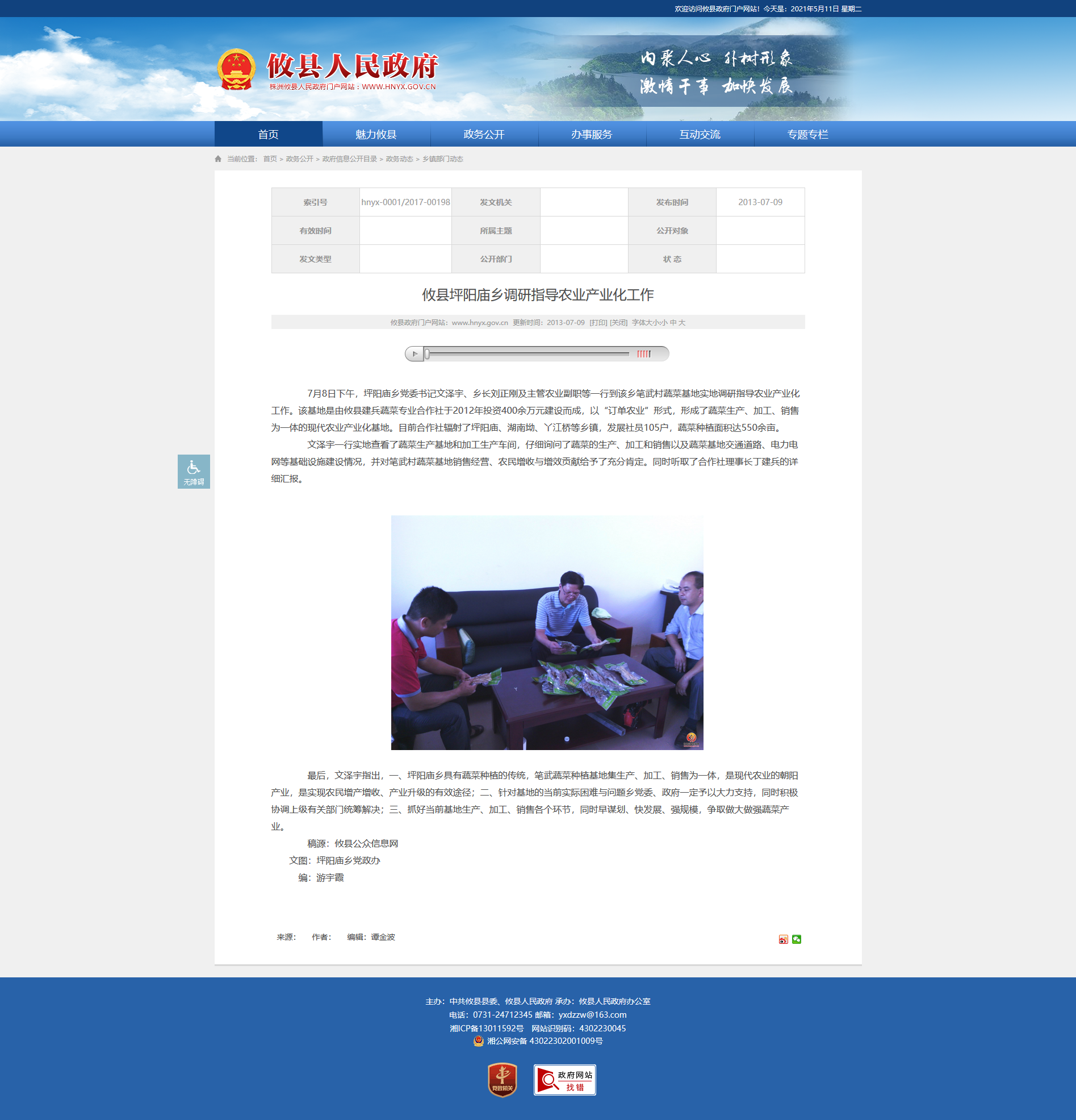 7月8日下午,坪阳庙乡党委书记文泽宇、乡长刘正刚及主管农业副职等一行到该乡笔武村蔬菜基地实地调研指导农业产业化工作。该基地是由攸县建兵蔬菜专业合作社于2012年投资400余万元建设而成,以“订单农业”形式,形成了蔬菜生产、加工、销售为一体的现代农业产业化基地。目前合作社辐射了坪阳庙、湖南坳、丫江桥等乡镇,发展社员105户,蔬菜种植面积达550余亩。