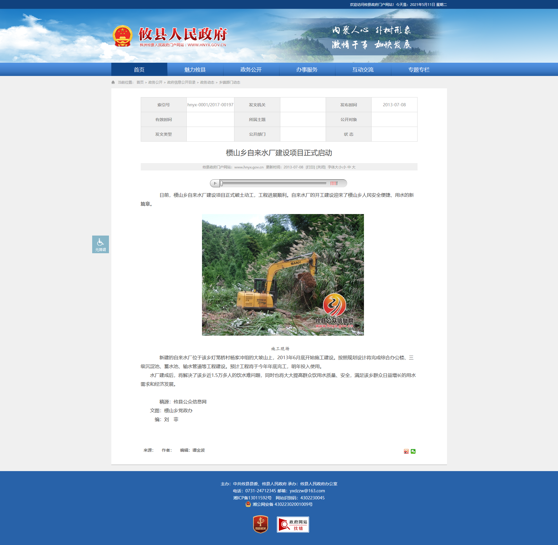 新建的自来水厂位于该乡灯笼桥村杨家冲组的大坡山上,2013年6月底开始施工建设。按照规划设计将完成综合办公楼、三级沉淀池、蓄水池、输水管道等工程建设。预计工程将于今年年底完工,明年投入使用。