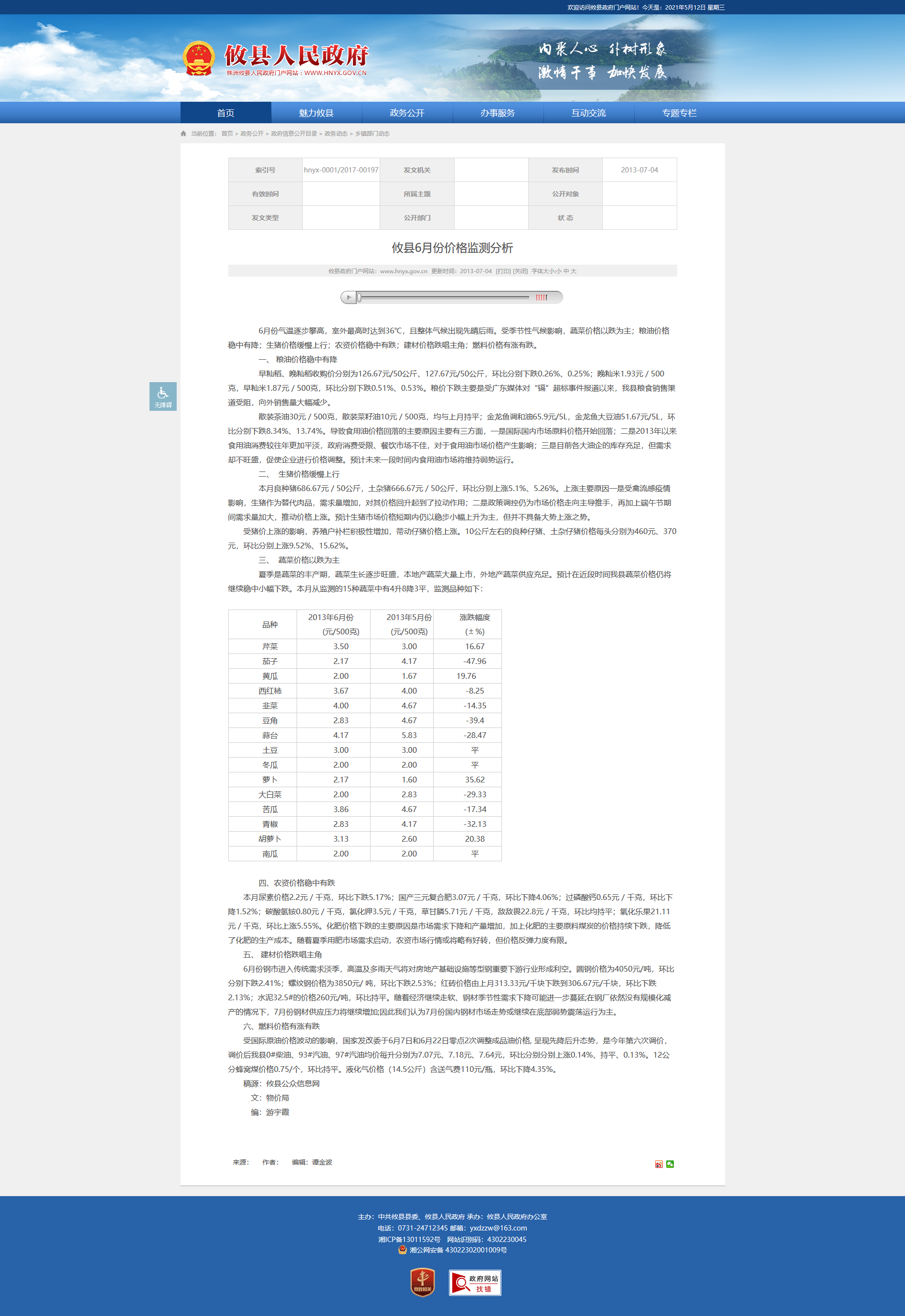 | 品种 | 2013年6月份 (元/500克) | 2013年5月份 (元/500克) | 涨跌幅度 (±%) |