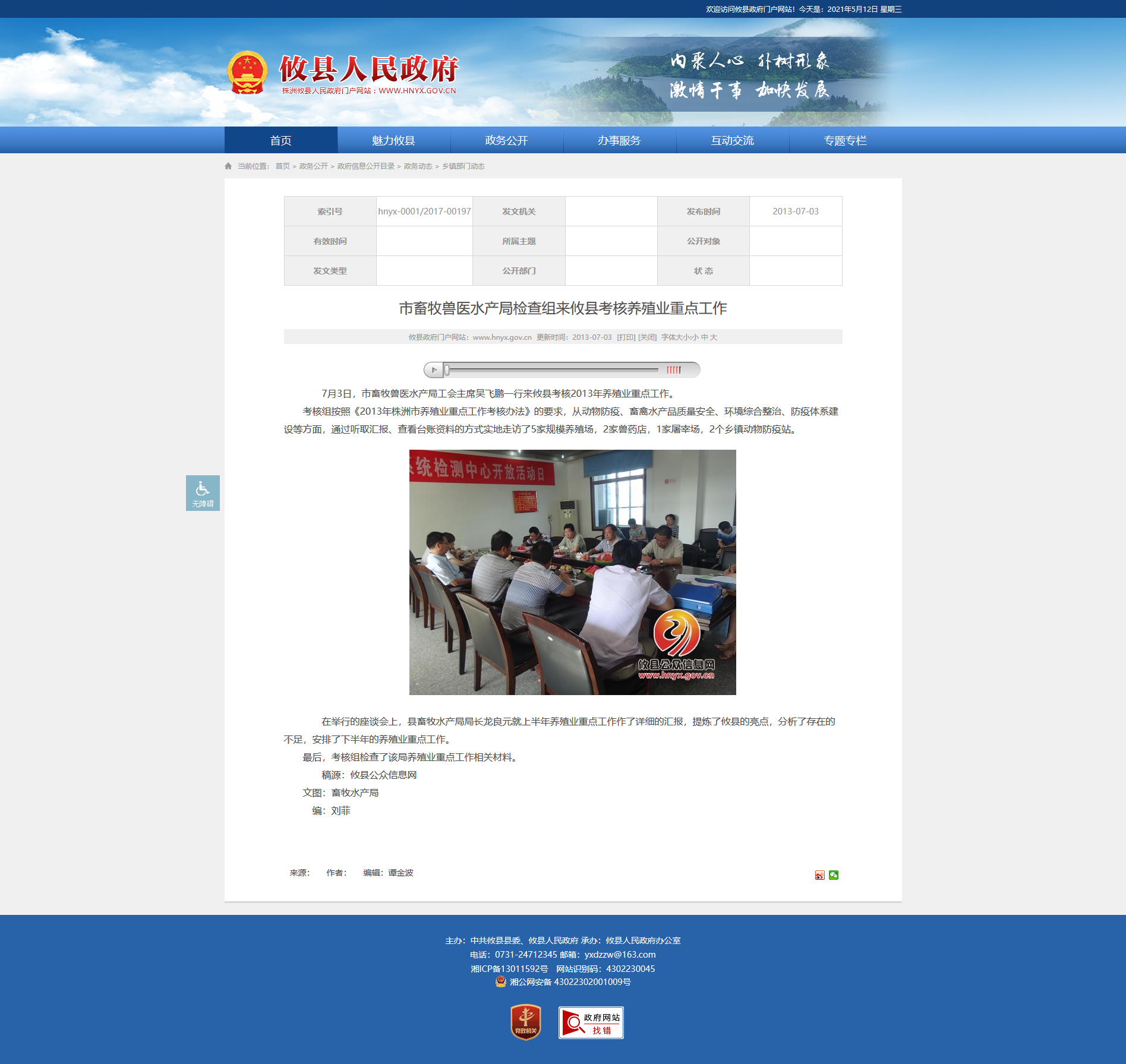 7月3日,市畜牧兽医水产局工会主席吴飞鹏一行来攸县考核2013年养殖业重点工作。