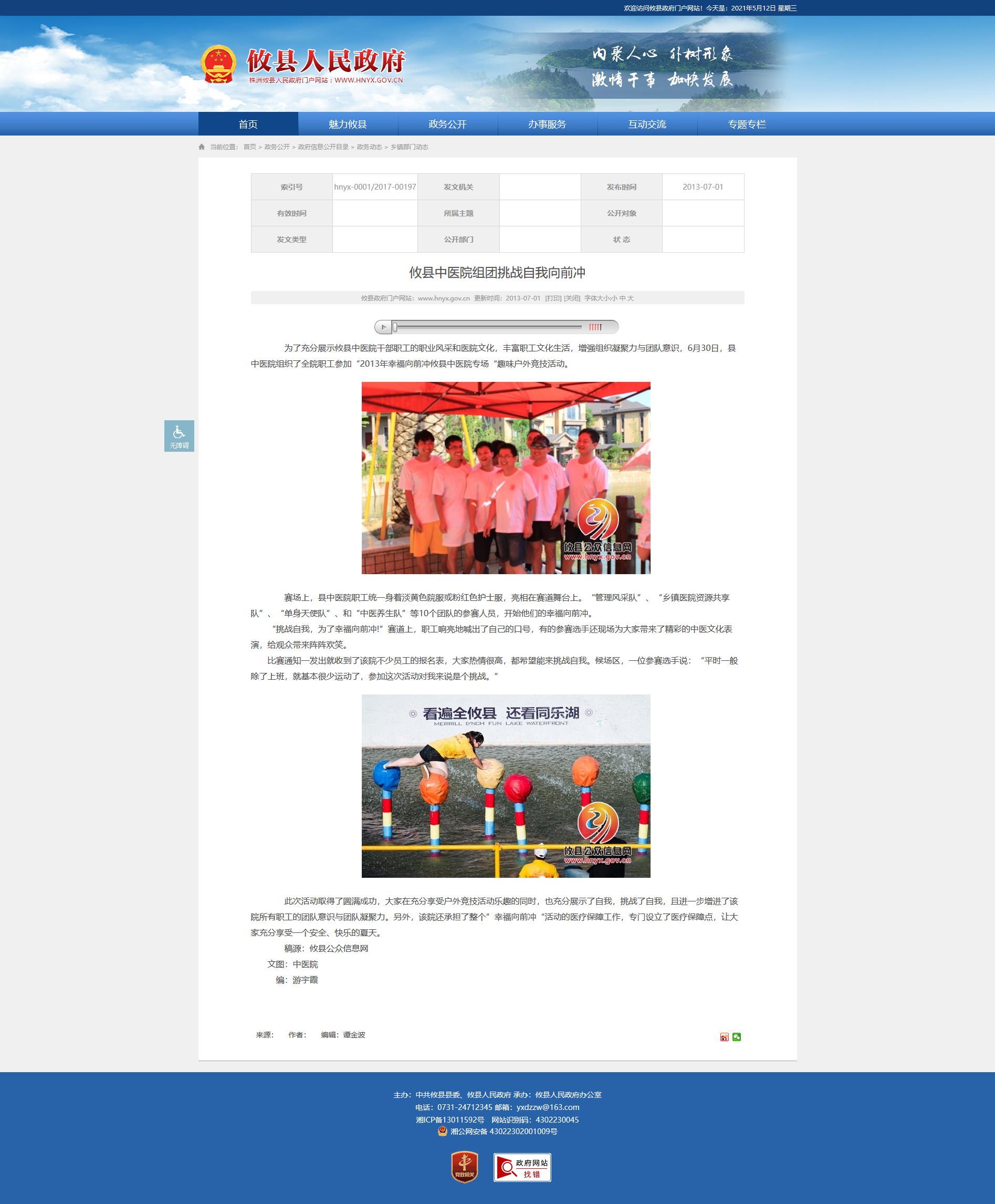 为了充分展示攸县中医院干部职工的职业风采和医院文化,丰富职工文化生活,增强组织凝聚力与团队意识,6月30日,县中医院组织了全院职工参加“2013年幸福向前冲攸县中医院专场“趣味户外竞技活动。