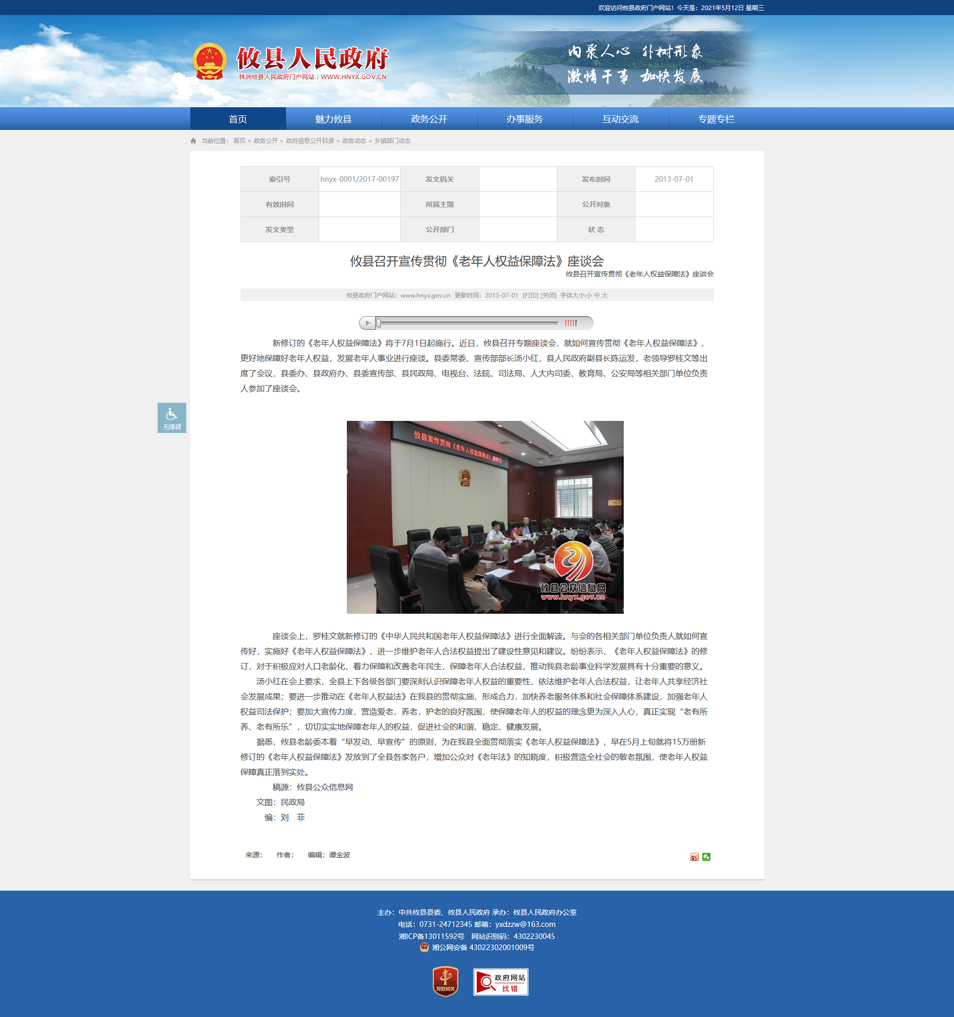 新修订的《老年人权益保障法》将于7月1日起施行。近日,攸县召开专题座谈会,就如何宣传贯彻《老年人权益保障法》,更好地保障好老年人权益,发展老年人事业进行座谈。县委常委、宣传部部长汤小红,县人民政府副县长陈运发,老领导罗桂文等出席了会议,县委办、县政府办、县委宣传部、县民政局、电视台、法院、司法局、人大内司委、教育局、公安局等相关部门单位负责人参加了座谈会。